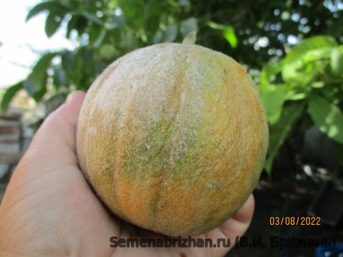 Уникальный, коллекционный, редкий сорт. Растение среднеплетистое, имеет небольшие плети 2 и 3-го порядка, мощное, длиной до 3-х м. Среднеспелый сорт (100 дней от всходов до созревания плодов), предназначен для выращивания в открытом и защищенном грунте. Плоды овальные, массой 1,0-1,5 кг. Поверхность плода зеленоватая с тонкими бороздками и ярко выраженной узорчатой сеточкой. Мякоть лососево-оранжевая, сочная, тающая, с высоким содержанием сахаров, очень вкусная и ароматная. Постоянно завязывает плоды до самых морозов.