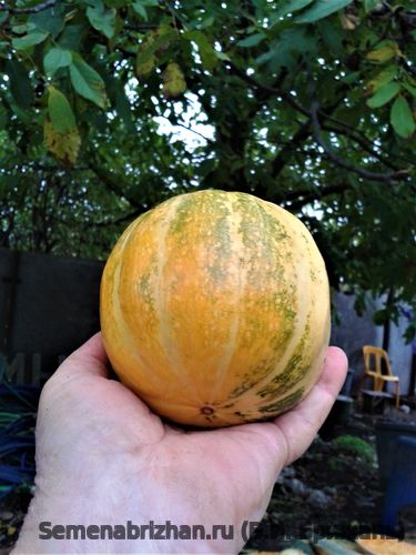 Раннеспелый, очень урожайный сорт (период от всходов до созревания 87-98 дней). Растение среднеплетистое. Плоды округло-овальные. В т. с.зелено-полосатого цвета, в биол. сп. – жёлто-зелёно-полосатые и крапчатые, массой до 350 гр. Отличные вкусовые качества плодов и отличная их лёжкость. Готовят по картофельным рецептам! Мякоть твердая, плотная, ярко золотисто-желтого цвета с салатовыми оттенками, сочная, сладкая, медового вкуса. Тыква, которая может заменить собой картошку! Поэтому готовить ее надо по картофельным, а не тыквенным рецептам. Отлично жарится с луком и солью. Вкус хороший и отличный. Созревание плодов дружное. Предназначено для выращивания в теплицах, под пленочными укрытиями и в открытом грунте (в южных регионах). Устойчив к антракнозу. Товарная урожайность около 5 кг/кв.м. Средневосприимчив к фузариозному увяданию, мучнистой росе, антракнозу, бактериозу. Сорт приспособлен к неблагоприятным погодным условиям! Устойчив к заболеваниям и перепадам температуры.