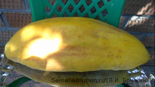 Этот необычный овощ – работа селекционера Павла Сараева. Он скрестил огурец с дыней и получил удивительный овощ. Растение раннеспелое (40-50 дней). На первый взгляд это не что иное, как огуречный куст, только листья более крупные. Плети вытягиваются до двух метров в длину. На них, когда придёт срок, образуются бутоны, из которых формируются завязи. А затем начинается чудо. Плоды на первых порах точь-в-точь огурцы, вытянутые по форме, длиной 8-12 сантиметров, темно-зеленые, густоопушенные, плотно прилегают к плетям. По мере отрастания пушок редеет и почти пропадает и становятся бледно-зелёные по цвету, бархатистые по текстуре кожицы. Она, кстати, очень тонкая, будто у яблока, подвержена повреждениям. Вкус таких плодов ярко выраженный огуречный, аромат тоже. Недозрелые его плоды (зеленцы) длиной до 12 см. можно срывать в конце июня — начале июля. Зеленцы можно есть свежими и перерабатывать — солить, мариновать, консервировать. К августу они полностью созревают, становятся сочными, ароматными, трёхкилограммовыми дыньками вытянуто-овальной формы, окрашиваются в светлый желтый цвет, иногда становятся сетчатыми. Мякоть душистая, очень сладкая и ароматная, семенная камера маленькая. Из зрелых плодов получается очень душистое варенье, пастила и повидло, а также другие сладкие, кондитерские изделия. Мякоть богата полезными веществами, кроме того, она обладает непревзойденным вкусом и нежным ароматом. Выделяется компактным плодоношением, так как завязывает плоды в нижней части кустов. Урожайность высокая - до 20 спелых плодов с 1 растения. Высокоурожайная, с дружной формировкой урожая, хороша для прохладного климата и короткого лета.