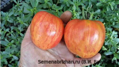 Экзотический, коллекционный сорт из Америки, для открытого грунта и простейших плёночных укрытий. Раннеспелый - до 100 дней, высокорослый (1,2 м) и сверх урожайный сорт. Одна кисть формирует 5-6 плодов. Всего таких кистей может быть до семи. Урожайность с метра квадратного – 6-7 кг. Плоды округло-вытянутые, плотные, аккуратные, гладкие, устойчивые к растрескиванию, весом до 120 грамм. Цвет красно- розовый, кожица покрыта жёлто-золотистой узорной росписью. Удобно собирать и хранить - лежкость отличная. При транспортировке плоды не повреждаются. Классический томатный кисло-сладкий вкус, рекомендованы как для свежего употребления, так и для консервирования. Является украшением грядки и обладают отличными потребительскими свойствами. Плоды обладают отличной лежкостью и транспортабельностью. Собранные помидоры могут достаточно долго храниться.