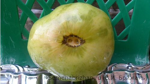 Томат Зеленый Гигант (в оригинале Green Giant) является действительно старинным сортом зеленоплодных томатов. Сам по себе он родом из Германии. Относится к индетерминантным сортам. Это среднеспелый, высокоурожайный и высокорослый томат. Куст мощный, может достигать высотой до 1,8 м, поэтому нуждается в подвязке к опоре и пасынкованию. Великолепные результаты достигаются при формировании растения в 1 или же 2 стебля. Лист у растения картофельного типа. Помидоры плоскоокруглые. В стадии зрелости они остаются зелеными, правда присутствует некоторая желтизна, при перезревании могут возникнуть розовые пятна. Вес может достигать 800 гр, но обычно в диапазоне 300- 600 грамм. Мякоть нежная, на вкус очень сладкие, имеется фруктовый привкус киви( мне так кажется). По консистенции тоже как киви нежные. Кожа не особо тонкая. К сожалению, склонен растрескиваться но не сильно и не глубоко. Это один из самых сладких зеленоплодных сортов. Урожайность впечатляющая - 8,5кг с куста. Плоды крупные по 2-3 шт.в кисти через 2-3 листа. Меньше 300гр. плодов не было.
