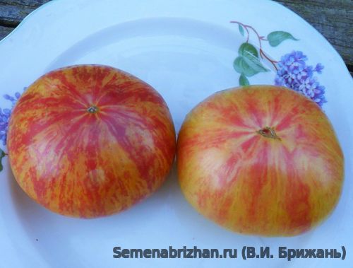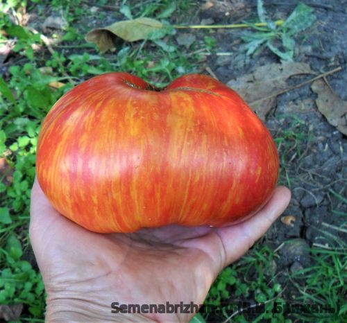 Новинка мировой селекции. Автор сорта Брэд Гейтс (Брэд Гейтс, Фермы диких кабанов, США). Также у коллекционеров ходит под названием Обед Любовника,Обед Влюбленных. Мощный индет, среднего срока созревания, с мощным регулярным листом, вегетативным типом куста. высокорослый до 2 м. интенсивного роста, формируется в 1-2 стебля. В кисти по 5 шт крупных плодов, требуется обязательная подвязка. Плоды плоско-округлые и «яблочные», полосатые биколоры, ярко-оранжевые в огненно-извилистые полоски. При полном созревании ярко-оранжево-красный, в разрезе жёлто-оранжевые с красным пятном в центре. Вкус приятный, сладкий, с лёгкой кислинкой и томатным ароматом, с оригинальной пряностью, средней массой 300 гр, отдельные плоды могут достигать 500 гр. Плоды не только очень красивые, но и очень вкусные, сладкие. ИСПОЛЬЗОВАНИЕ: в свежем виде, для салатов, соков и соусов. Устойчивость к болезням высокая. Сорт, вызывающий всеобщий восторг!