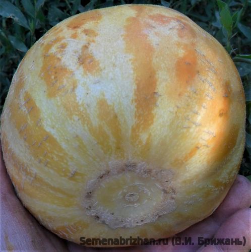 Оригинальный коллекционный ранний (до 90 дней) сорт дыни народной селекции. Эта дыня — настоящий реликт. Ее родина — горные долины Армении. Ох, до чего же она красивая! Растение длиной до 3 метров, с короткими плетями 2-3 порядков. Молодые завязи опушенные, но по мере роста, кожура их становится более гладкой. Плоды округлые, диаметром до 8 см, полосатые, сначала тёмно-зелёные, при созревании - огненно-золотые. Основа окраски желтая, а поверх нее множество широких огненно-красных полос. Мякоть у них белая, нежная, сладкая. А аромат просто опьяняющий! Когда они лежат в комнате, благоухание разносится невероятное! По размеру дыньки небольшие, около 300-500 г. На одном растении их бывает до 10 штук и больше. В мякоти содержится богатый набор полезных микроэлементов и витаминов. Очень вкусная в свежем виде, а также в варенье, в повидле, джемах, настойках и даже в вине. Потрясающая урожайность – плоды конвейером зреют один за другим. Быстро растёт, урожайная. Устойчива к болезням. Не разрезанная, она может долго храниться при комнатной температуре. В основном, дыню едят свежей – на десерт.