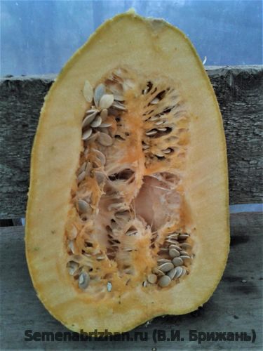 Надёжный и высокоурожайный среднеранний сорт-наваждение. Растение ветвистое, средней мощности, с многочисленными, необычайно нарядными плодами. Плоды отборные, грушевидно-цилиндрические, слегка ребристые, выровненные по форме и размеру с тонкой светло-жёлтой кожицей, с ярко-зелеными полосами, массой 0,8-1,5 кг. Мякоть кремовая, плотная, сахаристая, вкусная. Мякоть отличного качества, с ореховым привкусом, плоды отлично подходят для фаршировки и запекания. Великолепно подходит для начинки и выпечки даже сразу после сбора урожая. Отлично хранится до нового сезона, ещё больше накапливая сладость. Урожайность 8-12 кг с одного растения. Завязываемость плодов очень высокая, отменный урожай гарантирован в любую погоду.
