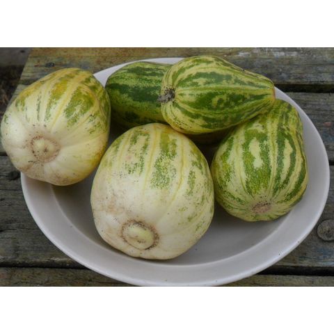(Citrullus Lanatus (Thunb) - Cucumis melo L - SSp pyreformis) – Страна происхождения - Китай. Ничем не отличается от обычной дыни по вкусу, консистенции и аромату, но имеет расцветку, более близкую к арбузу, а по своей форме напоминает огурец. Раннеспелая 40-50 дней, растение среднеплетистое, с зелёными округлыми листьями среднего размера, плеть имеет 2-3 плети второго порядка и 1-2 третьего порядка. Плоды расцветкой похожи на арбуз, округло-грушевидно-вытянутой формы, массой до 500 гр. Молодые зеленцы очень вкусные, хрустящие, с очень нежной мякотью, спелые в биол. сп. очень сладкие с тонкой кожицей, душистые – смесь аромата арбуза и дыни. Кожура тонкая,можно есть не очищая, как яблоко. Мякоть белая, очень сладкая и ароматная, по консистенции нежная, маслянистая и сочная, душистая, но с каким- то пикантным, кисловатым привкусом, на подобии арбузно-ананасного. В мякоти содержится богатый набор полезных микроэлементов и витаминов. Истинное лакомство для детей и взрослых. Очень вкусная в свежем виде, а также в варенье, в повидле, джемах, настойках и даже в вине. Из зрелых плодов получается очень душистое варенье, пастила и повидло, а также другие сладкие, кондитерские изделия. Очень устойчивое от болезней и погодных условий, чем обычные дыни, плодоносит до заморозков. Посадите не пожалеете, детишки будут в восторге. Потрясающая урожайность – плоды конвейером зреют один за другим. Болезнестойкий, высокоурожайный вид. Холодостойкий, засухоустойчивый.