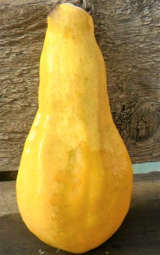 • Среднеспелый (80-90 дней) сорт, столового назначения. Растение плетистое, ветвистое, с многочисленными порционными плодами. Плоды необычной формы, в виде вытянутой груши или колбы, сегментированный. Окрас плодов - насыщенно-желтый. Средний диаметр тыквы - 15 см., массой 1,8-2 кг. Мякоть твердая, плотная, ярко золотисто-желтого цвета, сочная, сладкая, медового вкуса. Тыква, которая может заменить собой картошку! Поэтому готовить ее надо по картофельным, а не тыквенным рецептам. Отлично жарится с луком и солью. Вкус хороший и отличный. Созревание плодов дружное. Предназначено для выращивания в теплицах, под пленочными укрытиями и в открытом грунте (в южных регионах). Устойчив к антракнозу. Товарная урожайность около 5 кг/кв.м. Средневосприимчив к фузариозному увяданию, мучнистой росе, антракнозу, бактериозу. Сорт приспособлен к неблагоприятным погодным условиям! Устойчив к заболеваниям и перепадам температуры.
