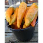 Сорт Рамиро входит в группу среднепоздних перчиков, к сбору плоды готовы примерно через 130-135 дней. Рекомендуется выращивание в укрытиях, при этом учитывают, что кусты высокорослые, небольшие парники и тоннели для них не подойдут. Перец представлен в виде хорошо развитого и мощного кустарника, по высоте кусты достигают почти 120 см, тип – кустовой, от основания сразу идут несколько стволов. Листва крупная, имеет многочисленное количество мелких морщин, окрас – тёмно-зелёный. Корневище и основной стебель, развиты достаточно хорошо, поэтому растение не нуждается в подвязке. Плоды имеют вытянутую форму, с характерной «горбинкой» и заломами возле плодоножки и в длину вырастают до 30 см. Вес перца находится в диапазоне от 90 до 160 г. Плоды формируются дружно, на растении – до 12-15 перчиков, с глянцевой кожицей. Перикарпий тонкий, внутри – небольшое семяложе с малым количеством семян. Во многом окончательные параметры зависят от условий выращивания, подкормок, ухода.Сначала все перчики зеленые, при достижении полной зрелости обретают желто - оранжевую окраску. По вкусу перчики очень сладкие, приятные, хрустящие с пикантным ароматом. По отзывам дачников, у Рамиро вкус несравнимый ни с одним сортом перца, недаром у него столько поклонников.