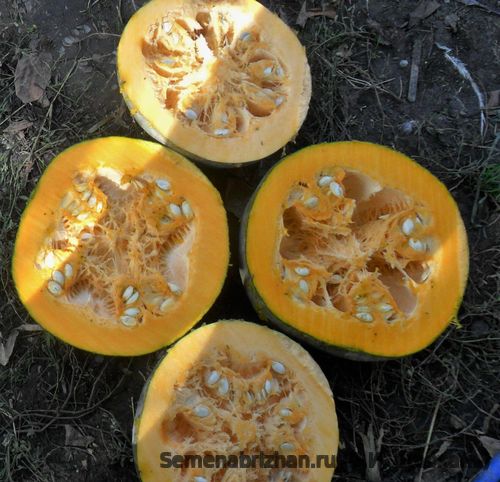 Реликвия из Франции.Отличный урожайный столовый сорт крупноплодной тыквы раннего срока созревания. Жаростойкий, засухоустойчивый, но за регулярный полив в период налива плодов отблагодарит щедрым урожаем. С одного растения можно получить до 27 кг плодов. Растение среднеплетистое, с некрупными листьями светло- зеленого цвета. Плоды овально-приплюснутой формы, сегментированные, гладкие, с корой темно-сине-зеленого цвета, массой 3,5-6 кг. Мякоть очень сладкая, оранжевая, толстая, хрустящая, крахмалистая, плотная, малосочная. Плоды сохраняют товарные качества в течение 250-270 дней после съема. Транспортабельность отличная. Урожайность товарных плодов 221 -268 ц/га.