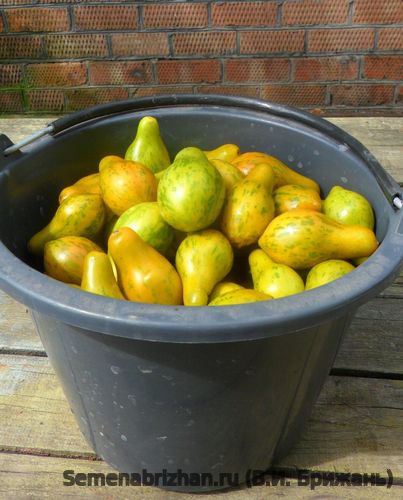 Очень урожайные – в кисти часто бывает 25-30 плодов. Универсальны в выращивании – могут возделываться как в открытом, так и в защищенном грунте. Детерминантный, высокорослый, быстро развивающееся. Кисть сложная, разветвленная, состоящая из 25-30 плодов. У сорта «Майкл Поллан» необычная форма плодов для томатов – это овощи в виде груши с носиком. К тому же, зеленый окрас в желтую полоску делает овощ похожим на арбуз. Поверхность томатов гладкая и ровная. Даже присутствует глянец. Мякоть изумрудного цвета, очень нежная, сладкая. Томаты небольшого размера, масса плодов составляет от 60-ти до 100 грамм. Мякоть очень сочная. Вкус – сладкий. Семян в созревших плодах – очень мало. Томаты обладают пряным вкусом. За сезон можно собрать с одного кустарника урожай до 3 кг. Из-за мякоти средней плотности томаты употребляют в свежем виде. Хороши они и для консервирования в целом виде.Очень популярен в ресторанах по всей Америке.