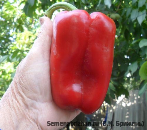 Семейная реликвия из США. Среднеспелый сорт. Период от всходов до созревания плодов 120-130 дней. Предназначен для выращивания в открытом грунте, парниках, весенних необогреваемых и обогреваемых теплицах. Растение высотой 50 - 75 см, полураскидистое. Плоды пониклые, неровный конус-призма, глянцевые, в технической спелости темно-зеленые, в биологической – темно-красные. Толщина стенки плода 5-6 мм. Масса плода 250-300 г. Вкусовые качества отличные. Сорт характеризуется дружной отдачей урожая и высокими вкусовыми качествами плодов. На кусте формируется 12-18 плодов. Пользуется популярностью у огородников-любителей. Устойчив к вирусу табачной мозаики, вертицилезу. Плотность посадки 5-раст./м2. Используется для свежего потребления и заморозки.