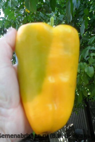 • Среднеспелый (период созревания 110-130 дней) крупноплодный сорт из Нидерландов. Для теплиц, парников и открытого грунта. Высота куста достигает 80-100 см, а при тепличном способе выращивания 120 см. Куст сильно облиственный, раскидистый, требует укрупнённой схемы посадки 90х50 см. Плоды призмовидно-кубовидной формы, крупные, длиной 18-20 см, в диаметре 8-10 см, массой 250-350 г, гладкие, блестящие,с  легка ребристые, с толстыми стенками. Окраска плодов в технической спелости зелёная, в биологической ярко-жёлтая. Мякоть хрустящая, нежная, сочная, с приятным сладким вкусом и ароматом.