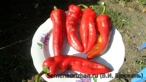 Сорт получен от коллекционера с Украины. Раннеспелый высокоурожайный сорт. Собирать перцы начинают через 110-115 дней после всходов. В средней полосе рекомендуется для пленочных укрытий, в южных регионах – для открытого грунта. Растения полуштамбовые, высотой 70-80 см, с хорошей нагрузкой урожаем: на каждом кусте одновременно формируется более 15 хоботовидных плодов. Длина плода 14-18 см, диаметр 3,5-4 см, массой 100-130 г, с толстыми сочными стенками толщиной 5-7 мм., вначале они зелёные, позже становятся красными, сладкие и вкусные. Замечательный вкус и приятный аромат делают его фаворитом в свежих салатах. А благодаря высокой урожайности (6-9 кг/м2 , при хорошей агротехники – до 12 кг/м2 ), плодов с лихвой хватит и для домашней кулинарии и для зимних заготовок.