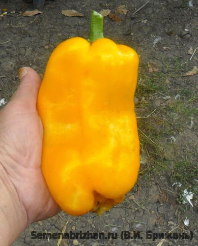 Среднеспелый крупноплодный сорт. На созревание плодов уходит 122-130 дня с момента всходов. Полураскидистые и среднерослые кусты сорта отличаются крепкими побегами. Их высота доходит до 65-70 см. Листья небольшие, темные. Расположение плодов пониклое. Плоды цилиндрические, сочные, сладкие, золотисто-желтого цвета, с толстой стенкой (8-10 мм), размер плодов; длина - 22 см.; околоплодник 7-8 мм; на стенке слабо выражены грани; семенных гнезд 3-4; окраска сначала зеленая, затем желтая. Растение с трудом удерживает урожай, средняя масса 230-250 гр. и до 400 гр. отличные вкусовые качества. Перцы имеют насыщенный вкус со сладкими нотками. Их используют для салатов и закусок, готовят маринованные овощи, ассорти, гарниры, аджику и айвар. Предназначен для культивации в теплицах и на открытых участках.