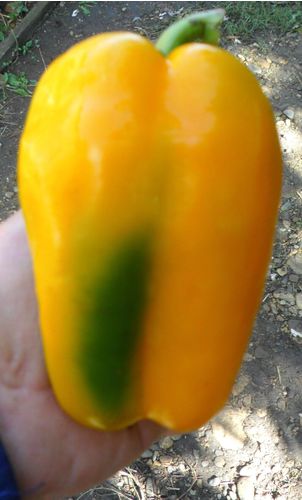 Семейная реликвия из Италии. Средний срок созревания сорта. От появления всходов до наступления технической спелости проходит от 115 до 120 дней. Куст раскидистый, среднерослый, достигает одного метра высотой. Овощ имеет призмовидную форму усеченного конуса, с тремя-четырьмя четко выраженными гранями и вдавленной плодоножкой. В период роста плоды окрашены в зеленый цвет, а по достижению биологической спелости их окраска становится золотисто-желтой. Мякоть очень толстая – 10 мм. Усредненная масса овоща варьируется в пределах от 200 до 250 гр. Особо крупные плоды могут весить до 400 гр. Их кожица тонкая, нежная, поверхность глянцевая. Подходит для всех видов потребления и переработки. Культура теплолюбивая и нуждается в регулярном поливе.