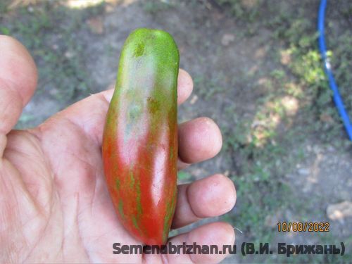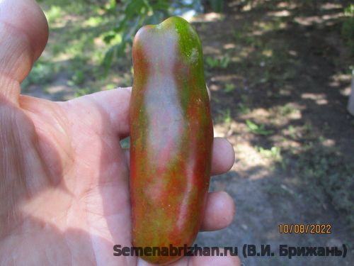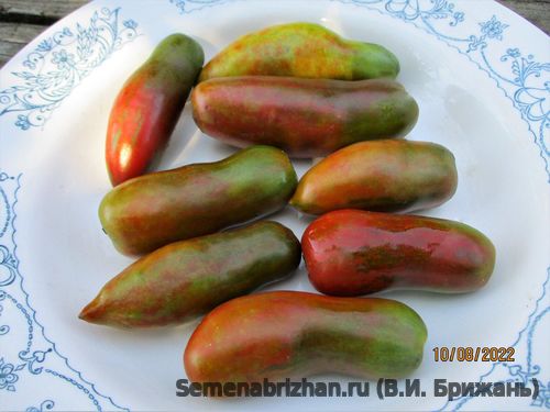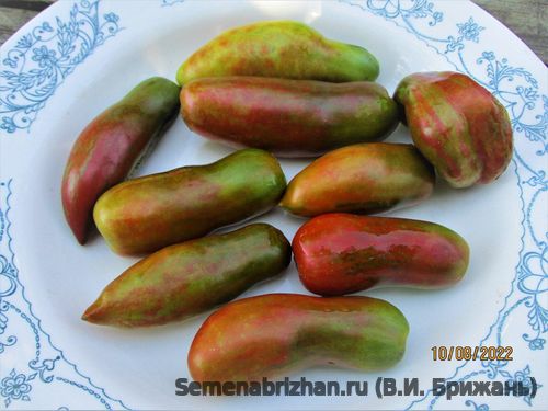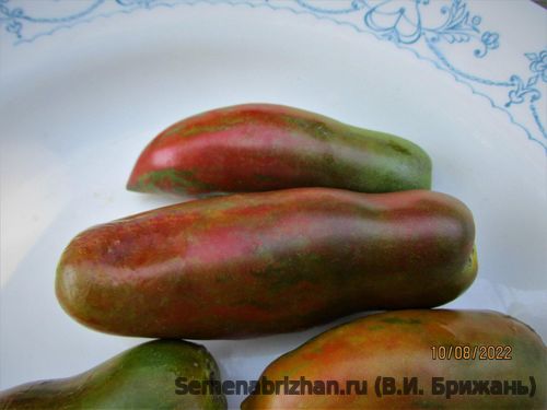 Детерминантный, ранне-среднеспелый, урожайный сорт, селекции Тома Вагнера, США. Можно не формировать, но удалять нижнюю листву. Хорошая завязываемость в стрессовых условиях. Вызревание плодов наступает на 92–115-й день после полных всходов. Плодоношение до заморозка. Обильный урожай. Для теплиц и открытого грунта. Куст раскидистый, высотой около 0.5 м. В теплице стебли до 0.9 м. Образует плоды удлиненной формы с небольшим носиком, длиной 10-15 см,. Томаты красивого тёмно-красного цвета в полоску с зеленым и почти золотым с бронзовым оттенком и которые темнеют в полной спелости плодов. Умеренно плотные и лёжкие, трещиноустойчивые. Вес плодов 60-120 гр. Хороший сбалансированный вкус. Отличные вкусовые качества плодов позволяют активно использовать их в свежем виде в составе множества блюд. Также томаты подходят для засаливания, в домашней переработке, хороши для консервации, пасты. Сорт устойчив к основным томатным заболеваниям. Урожайность стабильная и составляет 1.0–5.6 кг/кв. метр.