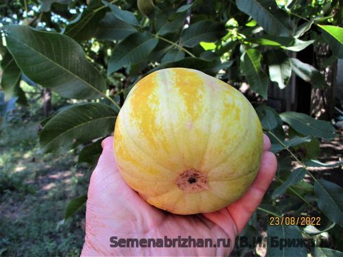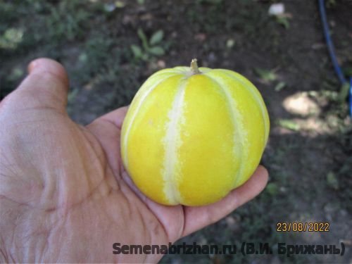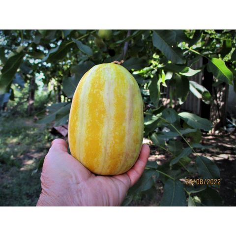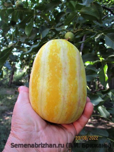 Ранний и урожайный Корейский коллекционный сорт дыни с нежной кожицей, созревает в среднем за 75 дней после всходов, хороший выбор для северного садоводства. Растение среднерослое, плетистое. Плоды овально-вытянутые, длиной до 12 см, в диаметре 6-8см., массой 400-800 грамм. Окрас плодов оранжево-желтый с белыми полосами. Поверхность плода: гладкая, сегментированная. Кожица очень тонкая, как у яблока, плод можно есть не очищая. Мякоть белая, хрустящая, сладкая, сочная, очень ароматная и просто тает во рту. Из зрелых плодов получается очень душистое варенье, пастила и повидло, и даже вино, а также другие сладкие, кондитерские изделия. Истинное лакомство для детей и взрослых. Обладает огромной урожайностью. Плоды отлично сохраняют свои товарные качества при хранении и при транспортировке. Холодостойкий, болезнестойкий, засухоустойчивый, высокоурожайный сорт. Урожайность высокая, стойки к заболеваниям и засухе.