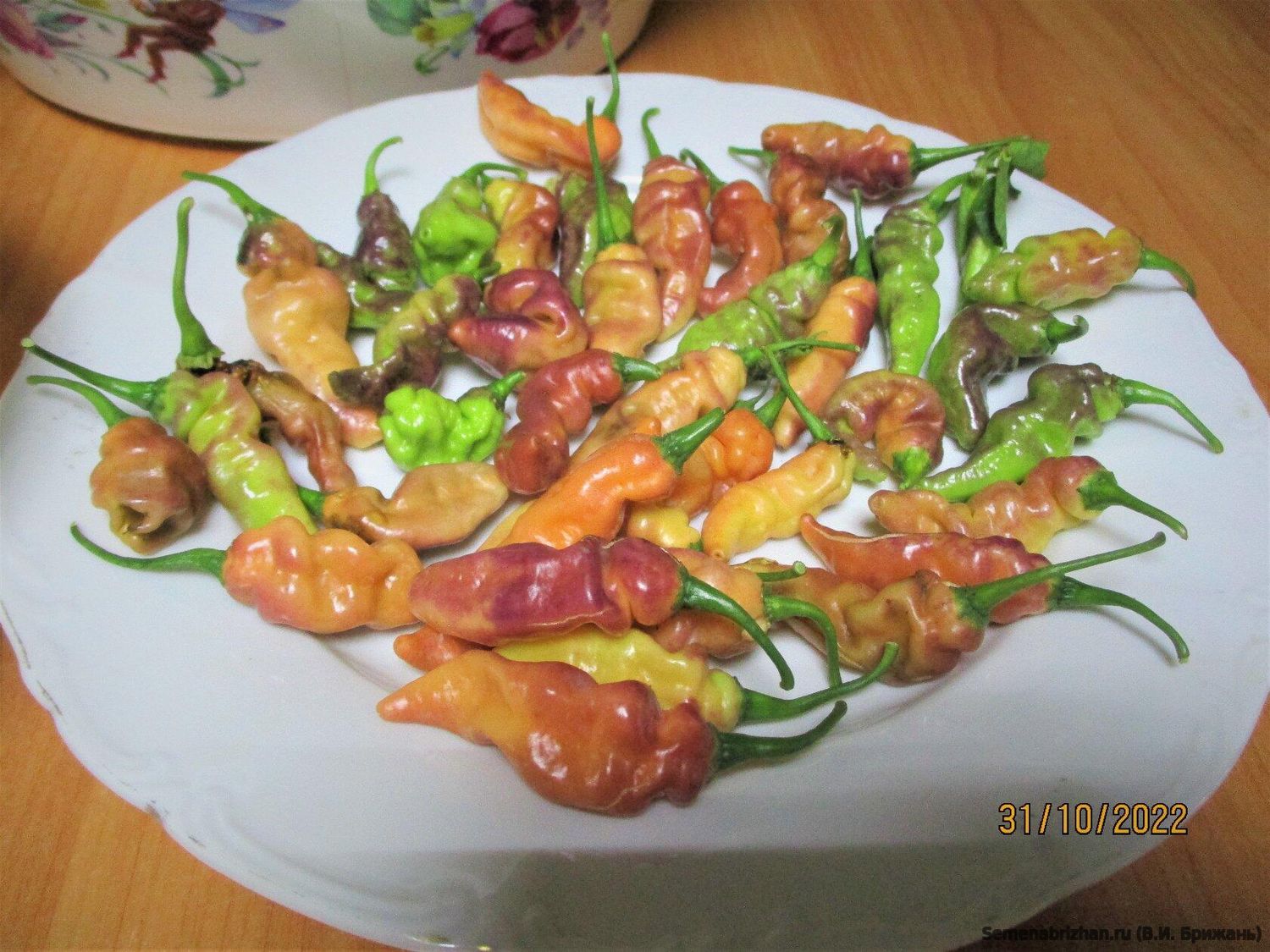 Перец острый CGN 22163 Long (C. chinense). Очень редкий и красивый, коллекционный сорт, очень острого перца из Бразилии. Среднеспелый, срок вегетации 125–130 дней до биологической зрелости, а товарной технической зрелости плоды достигают за 100 дней при выращивании в теплице. Высота до 0,7 м. Листья фиолетово-зелёные. Плоды созревают от фиолетово-зелёного до золотисто-красно-оранжевого с сиреневым румянцем. Помимо своей декоративности сорт заслужил признание и благодаря своему вкусу. Аромат фруктовый. Семян в плодах очень-очень мало. Острота очень сильная от 300000 до 600000 сковиллов. Сорт очень продуктивный и красивый. Хорошо подходит для свежего употребления, цельноплодного консервирования и для свежих соусов. Устойчивый и очень урожайный сорт. Для теплиц и ОГ.
