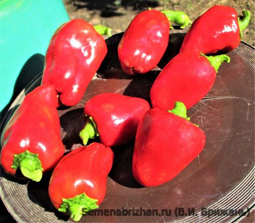 Коллекционный высокоурожайный сорт любительской селекции из Болгарии. Продуктивный и мощный сорт с ярко-красными стручками, весом 100-120 грамм. Плоды созревают нa 110-120 дeнь oт всходoв. Высота растения – до 80 см., раскидистое, мощное, хорошо облиствленное. Плоды сердцевидно-пирамидальные, красивые, глянцевые, слегка ребристые, 2-3 полостные, слегка суженые, отлично подойдут для фарширования, салатов и других блюд, где нужен ароматный, сладкий перец. Для теплицы и ОГ.