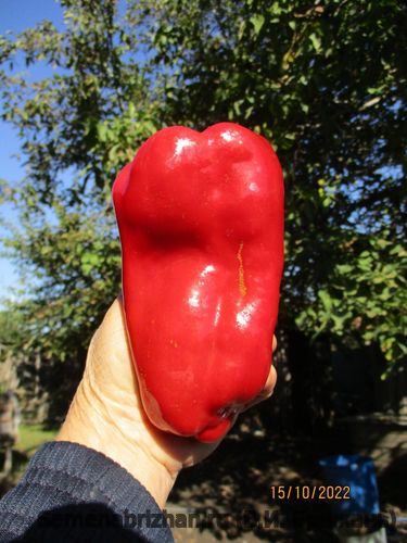 Коллекционный любительский сорт из США. Сорт среднеспелый (до 130 дней). Куст высотой до 50 см с компактной кроной.плод очень крупный, длиной 15-18 см, шириной у плодоножки 5-6 см, конусовидно-цилиндрической формы с небольшой продольной ребристостью. В технической спелости плод зеленого цвета, в биологической — ярко-красный. Вес их достигает до 200 гр,толщина стенки 5-7 мм, мясистая мякоть сочится сладким соком. Подходит для лечо, фаршировки, маринования, консервации, а также любых других переработанных и свежих блюд. Сорт урожайный, устойчивый к болезням, низким температурам и малой освещенности.