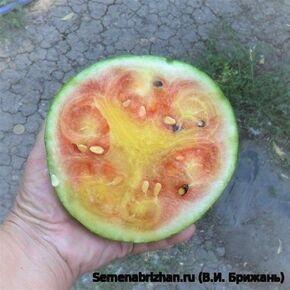 Старинный коллекционный сорт из штата Миссури, США. Сорт раннеспелый, от всходов до начала созревания 60-63 дня. Растение средней мощности, среднеплетистое. Длина главной плети менее 2-х метров. Стебель с редким опушением. Завязь шаровидная с редким опушением. Плоды шарообразной формы, поверхность гладкая. Цвет фона плодов светло-зеленый, рисунок - узкие темно-зеленые полосы. Вес плодов: 1.5-2.5 кг. Мякоть интенсивно оранжево-розово-красная, зернистая, нежная, сладкая, сочная,сахаристая с оригинальными вкусовыми качествами и содержанием сухих растворимых веществ 12-13 %. Назначение – рекомендуется для употребления «с грядки», приготовления сочных цукатов и лечебного арбузного меда, для засолки и маринования. Этот арбуз ценится садоводами за необычный светлый вид коры и классический «сахарный» вкус мякоти, напоминающий десерт. Вкусовые качества отличные. Урожайный арбуз наверняка захочет посадить у себя на участке огородник, предпочитающий культуры с оригинальными плодами. Многоплодный, до 10-15 плодов на одном растении при регулярных сборах. Великолепный сахарный сорт арбуза, отличающийся таким ценным свойством, как лежкоспособность в течении 2-2,5 месяцев после съема плода. Засухоустойчив, слабо восприимчив к фузариозу и антракнозу. Предназначен для выращивания в пленочных теплицах и в открытом грунте.В пакете 5 шт. семян.