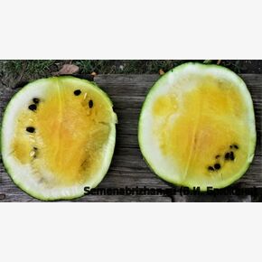 Раннеспелый коллекционный, урожайный сорт из США. Срок созревания: 78-85 дня. Создан в 1986 году в Университете Флориды. Сорт представлен мощными, крупными сильными, растениями, с большим количеством боковых плетей и главной плетью длиной до 3 метров. Лист средне-крупного размера, сильно рассеченный. Стебель округло-граненый, средней толщины, слегка опушенный. Листовая пластинка средняя или крупная, достаточно рассеченная, с узкими долями. Завязь шаровидная, немного опушенная. Плод овальной или шаровидной формы, гладкий, массой 1-3 кг. Кора толщиной 1,5-2,5 см. Поверхность гладкая или сегментированная, мраморная. Фон светло-зеленый, рисунок —тонкая сетка темно-зеленых прожилок. Мякоть плодов этого раннего сорта ярко-жёлто-оранжевая. Урожайный арбуз наверняка захочет посадить у себя на участке огородник, предпочитающий культуры с оригинальными плодами. Сорт славится по причине потрясающего аромата мякоти, в котором отчётливо слышны нотки манго. Овальные по форме плоды растения весят порядка 3 кг, сохраняют отличный вкус, товарный вид в течение месяца. Сорт считается неприхотливым, адаптированным к непростым погодным условиям. Мякоть сахаристая, тёмно-кремовая, очень сладкая, сочная, с прекрасной текстурой и приятным ароматом, нежная, сочная,сахаристая с оригинальными вкусовыми качествами и содержанием сухих растворимых веществ 12-13 %, волшебной радуги цвета и вкуса! Назначение – рекомендуется для употребления «с грядки», приготовления сочных цукатов и лечебного арбузного меда, для засолки и маринования. Этот арбуз ценится садоводами за необычный светлый вид коры и классический «сахарный» вкус мякоти, напоминающий десерт. Способность завязывать плоды даже при низких температурах и в условиях недостатка освещения. Совершенно неприхотлив. Многоплодный, до 10-15 плодов на одном растении при регулярных сборах. Плоды хорошо хранятся после съёма. Очень ранний сорт с высоким содержанием сахаров.Сохраняет свой превосходный вкус и спелую текстуру в течение длительного времени после срезки (через 100 дней после всходов). Предназначен для выращивания в пленочных теплицах и в открытом грунте.Сорт относительно засухоустойчив, слабо восприимчив к мучнистой росе, антракнозу и фузариозу, отлично подходит для холодных мест. Сорт считается неприхотливым, адаптированным к непростым погодным условиям.В пакете 5 шт. семян.