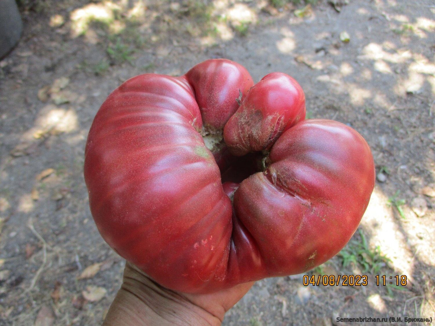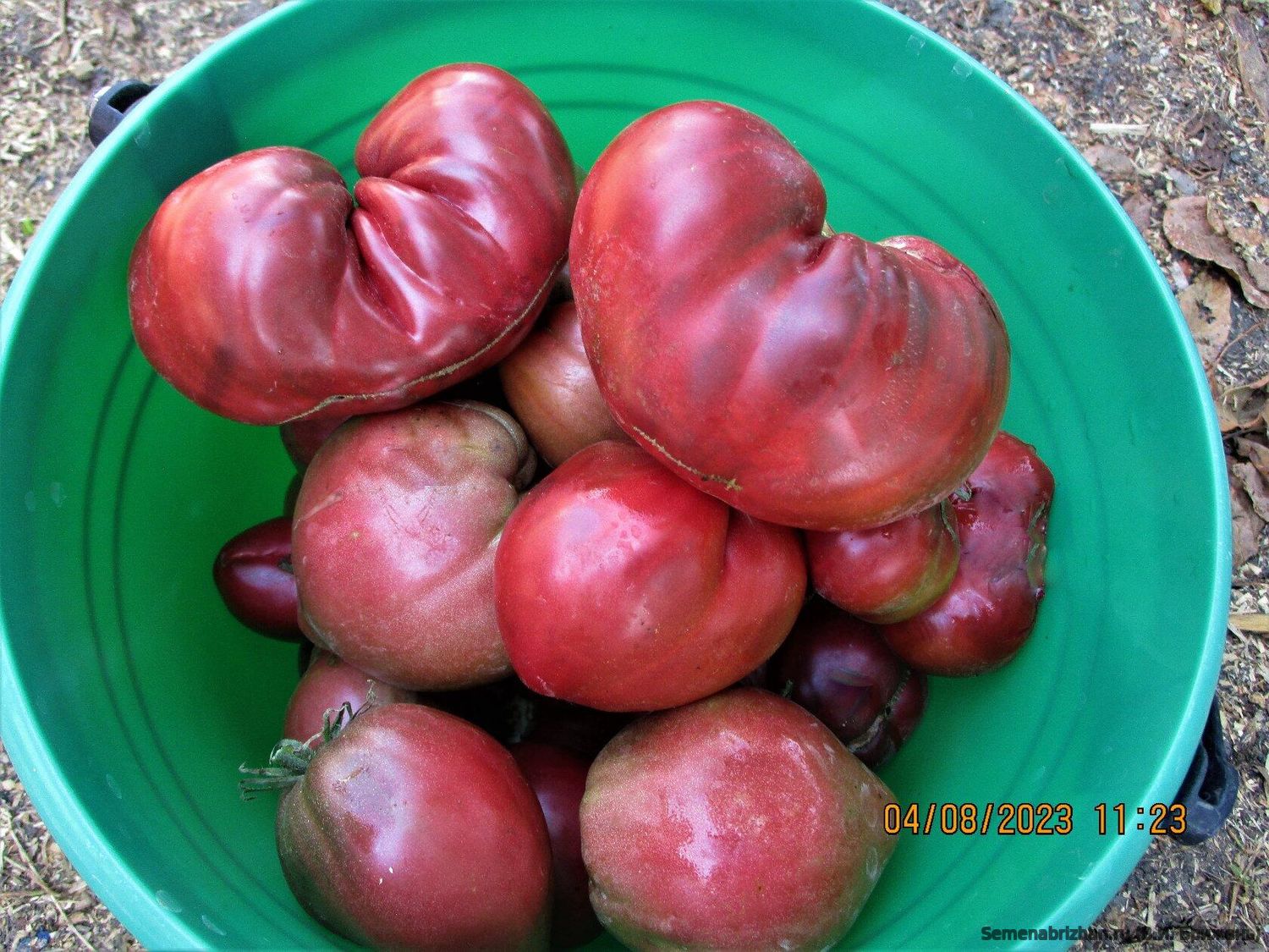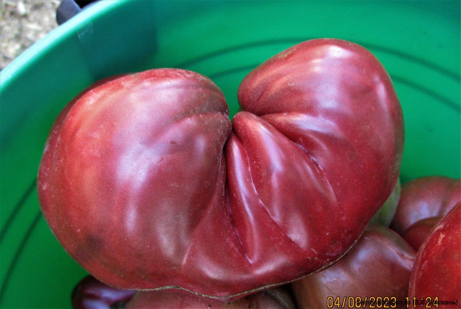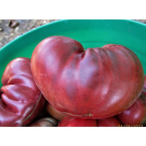 Среднеспелый (100-105 дней), детерминантный, редкий сорт томата для открытого грунта и пленочных укрытий. Куст штамбовый, высотой до 0,5-0,7 метра, не требует пасынкования (или до первой кисти). Лист морщинистый, обычного типа. Плоды сердцевидные, в стадии зрелости пурпурно-бордового цвета, весом 100-200 г, мясистые, малосемянные, хорошего вкуса. Плоды отличаются не только оригинальной окраской, но и очень хорошим вкусом. Желеобразная, не рыхлая мякоть, маслянистая, на вкус с легким фруктовым ароматом, пикантная, скорее сладкая, чем кислая. Достоинство сорта: удачное сочетание низкорослости с крупноплодностью. Эти томаты лучше всего подходят для свежего потребления и получения соков. Урожайность можно было бы назвать средней – до двух килограммов с одного куста. Из достоинств, кроме вкусовых характеристик – низкорослость, простота в уходе, дружная отдача урожая.