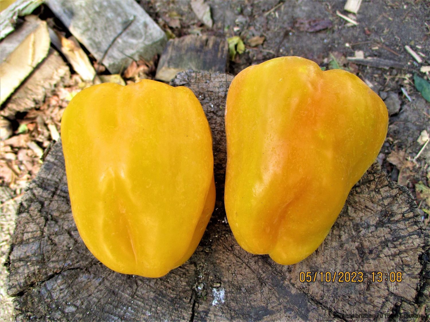 Коллекционный, редкий, крупноплодный, отечественный сорт. Сорт раннеспелый, вступает в плодоношение через 110-115 дней от полных всходов. В средней полосе рекомендуется для теплиц, в южных регионах пригоден для открытого грунта. Растения штамбовые, 70-80 см высотой, с крупными, пониклыми плодами. Плод кубовидной формы, 3-4-х-камерный, мясистый, в биологической спелости – темно-желтый. Средняя масса товарного плода 180-320 гр, стенки толстые, до 1,2 см, очень сладкие, сочные, с сладко-десертным, перечным вкусом. Для салатов, цветных лечо,фарширования,заморозки, для приготовления на гриле. В сезон с «квадрата» удается снять до 9 кг плодов. Вкусовые показатели высокие, рекомендуется для использования в свежем виде и домашней кулинарии.