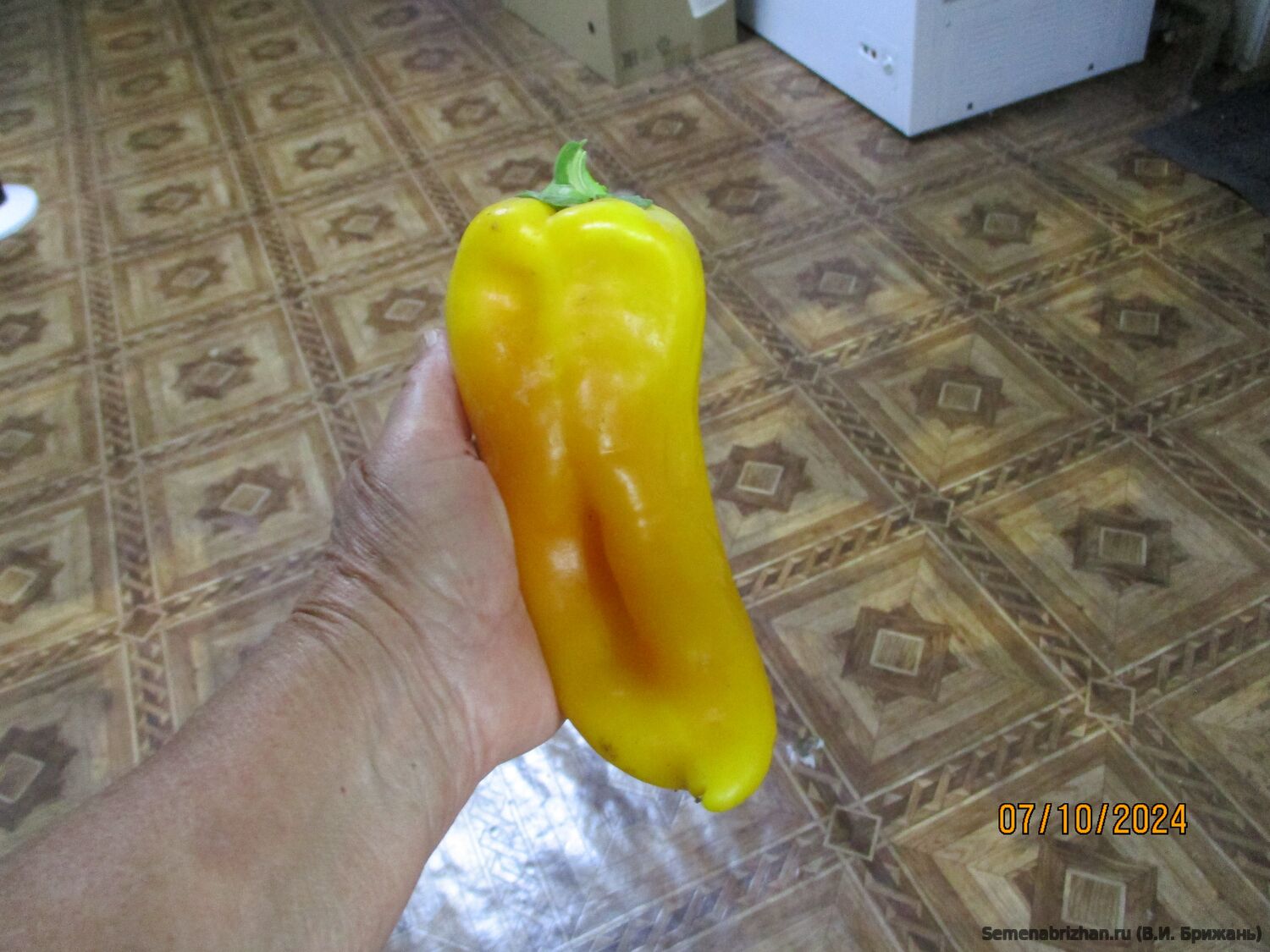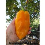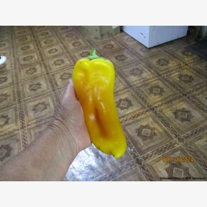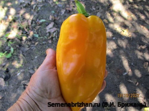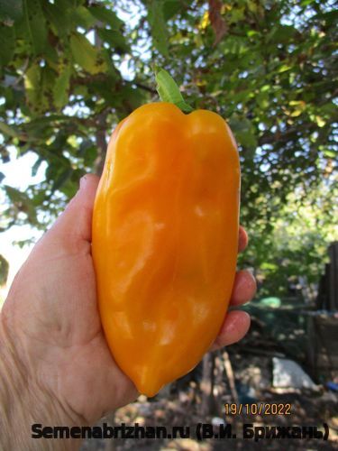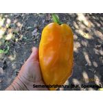 Коллекционный, любительский, индетерминантный, крупноплодный сорт перца из США. Среднеспелый,от всходов до плодоношения 110-115 дней, длительного плодоношения. Предназначен для выращивания в открытом грунте и под пленочными укрытиями. Растения полураскидистые, высокие, 85-100см. и более, густооблиственные. Плоды удлинённо-призмовидные, 3-4-х камерные, с плодами длинной до 20 см, в диаметре 12см, с толстыми (8-12 мм) стенками, массой до 300 гр. В технической спелости зеленые, в спелом виде плоды золотисто-оранжевые цвета. На разрезе светло-золотой. Вкусовые качества отличные, мякоть сочная, сладкая, с приятным ароматом. В ресторанах эти перцы часто подают жареными или готовят на гриле. Используется для потребления в свежем виде, консервирования, маринования, фарширования, лечо, домашней кулинарии. Вкусовые качества отличные, мякоть сочная, сладкая, с приятным ароматом. Также они идеально подходят для приготовления паприки, так как при сушке их аромат усиливается. Сорт урожайный, устойчивый к болезням, низким температурам и малой освещенности. Имеет растянутые период плодоношения (две-три волны урожая). Устойчивость к ВТМО. Устойчив к вирусным болезням. Перец устойчив к вертициллезному увяданию (Va, Vd), вирусу табачной мозаики (ToMV). Преимущество данного сорта: даёт стабильно высокие урожаи крупных плодов красивой формы. Урожайность под пленкой – 8-10 кг/ м2. В пакете 5 шт. семян.
