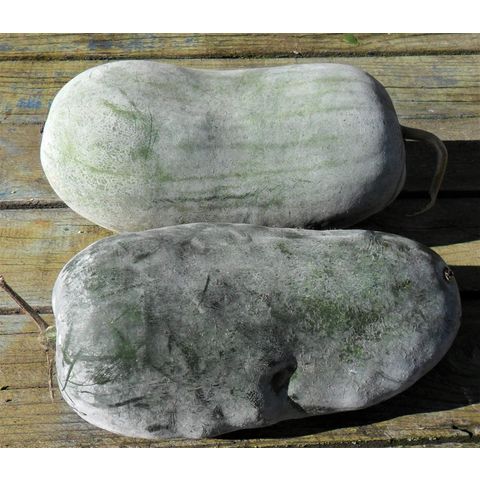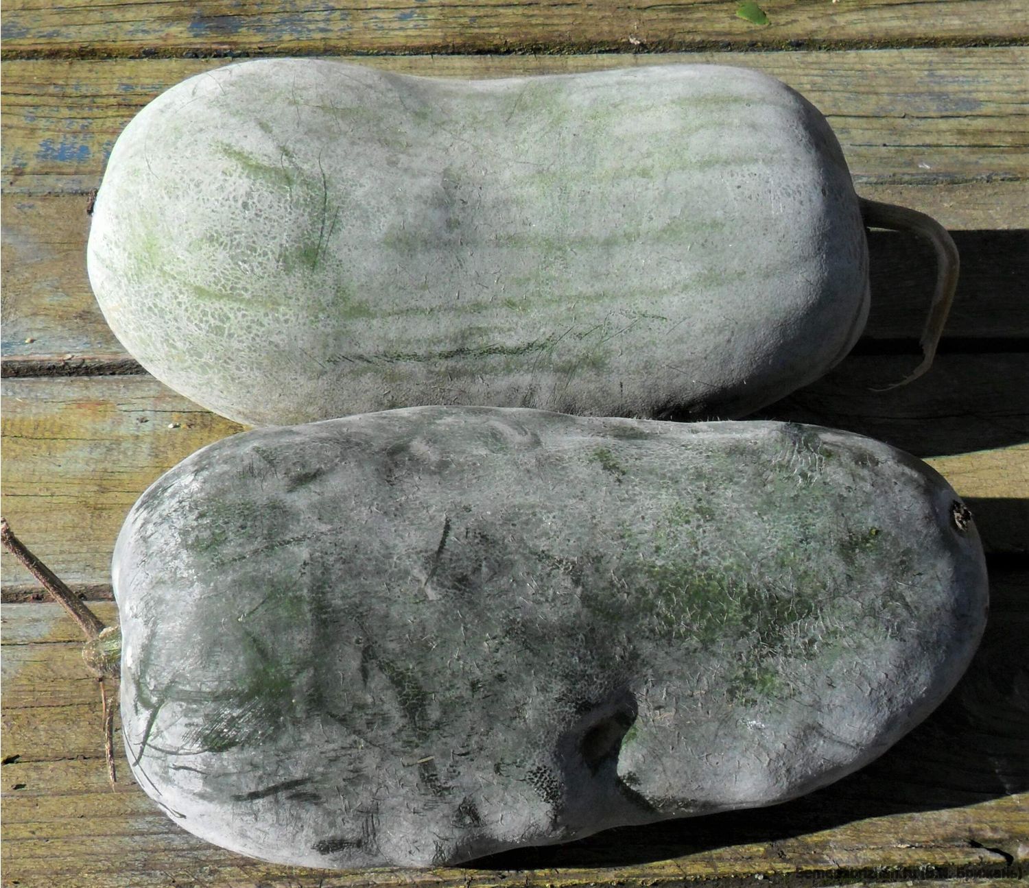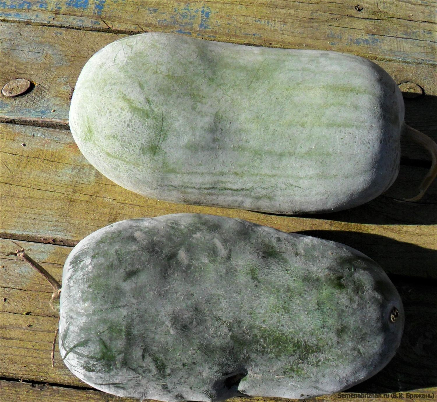 • (Benincasa hispida (Thund) Cogn). Восковая тыква. Однолетнее травянистое растение — родственник тыквы, большей частью известна в странах тропической Азии, которую ещё называют тыква зимняя восковая, тыква белая индийская, китайская калебаса. От всходов до созревания плодов проходит от 60 до 120 дней. На длинном ребристом ползучем стебле расположены крупные пятилопастные листья на черешках. В пазухах листьев имеются усики, с помощью которых бенинказа цепляется за почву или поднимается на опору. Раздельнополые жёлтые ароматные цветки с пятью лепестками располагаются на одном растении, одиночно в пазухах листьев. Незрелые плоды имеют густое опушение, которое исчезает ко времени созревания, из-за этой особенности их называют «пушистая дыня» (fuzzy melon). Постепенно плоды покрываются мощным восковым налётом, который отталкивает влагу и хорошо предохраняет тонкую кожицу от повреждений и проникновения возбудителей грибных и бактериальных болезней.  Зеленая тыква с восковым налетом. Недозрелые плоды, как правило, используют как кабачки (жарят, маринуют). Плоды округло-удлинённые, до 25 см, в диаметре 13 см, голубого оттенка, весом 2-3 кг. Затем он слегка сереет и покрывается выраженным восковым налетом и достигает 4-5 кг. Этот естественный белый покров и позволяет тыкве долго храниться. Зрелые плоды, с белой, упругой, сочной, сладковатой мякотью, содержащей много пектиновых веществ, употребляют для еды, а также используют в кондитерской промышленности. Плоды хорошо дозревают в комнате при 16-25°С. Урожайность незрелых тыкв 3,8-4,2 кг/м2, созревших 7-9 кг/м2. Необычный сорт с салатными плодами. Самые вкусные в жаренном виде из всех сортов. Красота на огороде. Отличная лёжкость до 14 месяцев. Много вяжется на кусту. Вкусная жаренная и консервированная, или фаршированная и запечённая в духовке.Собирают плоды бенинказы так же, как и обычную тыкву, до заморозков. Следует однако не забывать, что несозревшие плоды восковой тыквы долго лежать не будут. Их рекомендуется использовать в ближайшее время, или очистить, порезать и заморозить. В пищу используют как молодые (недозревшие) плоды бенинказы, так и вызревшие. Первые можно есть без тепловой обработки, к примеру, в натертом виде в салатах. Из созревших плодов восковой тыквы готовят каши, запеканки, супы, различные овощные гарниры, сладкие цукаты, соки. Она необычайно вкусна в консервированном и маринованном виде. В семенах содержится немало целебных веществ — фитостерины, кукурбитол, каратиноиды, органические кислоты, витамины, растительный белок, поэтому их применяют для защиты организма от вредных воздействий среды. Отличная лёжкость до 14 месяцев. Мякоть белая, очень вкусная, совсем не похожа на привычную тыкву, и в тушеном виде скорее напоминает какие-то морепродукты. Самые вкусные в жаренном виде из всех сортов. От появления всходов до цветения бенинказы проходит от 6 до 9 недель, плоды созревают в течение 2–3 месяцев. Семена сохраняют всхожесть до 8 лет, свежесобранные семена требуют дозаривания. Семена желательно проращивать при повышенной температуре( 28-32°С). В пакете 3 шт. семян.