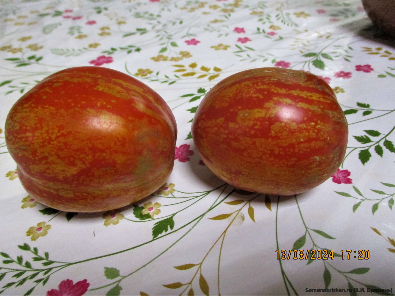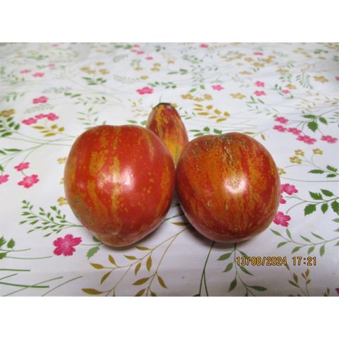 • Старинная, редкая, коллекционная, фамильная реликвия из Польши. Индетерминантный, высокорослый (1,7-1,9 м), среднеспелый сорт. От всходов до сбора первого урожая 95- 100 дней. Первое соцветие закладывается над 8 листом, последующие через 2-3. На простых кистях образуется около 7 плодов, массой 100-120 г. Плоды 2-х камерные, цилиндрические, слаборебристые или удлинённые сливовидной формы с носиком, золотистые с розовыми полосами, и антоциановыми неровными штрихами по всему томату.  Мясистые, малосемянные, вкусные, собраны в кисти. Большая урожайность. Среди аналогичной формы томатов этот томат является одним из лидеров по вкусовым качествам, хорошей наполненности семенных камер и по толщине стенок. Томат хорош для фарширования, засолки и маринования. Сорт устойчив к вирусу томатной мозаики (ToMV), альтернариозу (Asc), бактериозу (Pst), фузариозному (Fol 1-3) и вертициллёзному (Va, Vd) увяданию. Плотность посадки 3,5-4 растения/м2. Урожайность