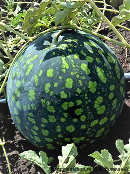 Шедевр отечественной селекции, великолепен и снаружи, и на вкус! Плетистые растения формируют первый урожай в поздне-средние сроки – спустя 85-90 дней от появления всходов.Растение плетистое, главная плеть длинная. Лист среднего размера, серо-зелёный, сильнорассечённый, морщинистый. Плод широкоэллиптической формы, зеленого цвета с мозаичным рисунком из светло-зеленых пятен. Кора средней толщины. Мякоть розового цвета без волокон, зернистая средней плотности, отличного вкуса, сахарная, сочная. Семена коричневого цвета с рисунком в виде точек и пятен., среднего размера. Масса одного плода в теплицах средней полосы – около 3-5 кг, в южных регионах – 7-12 кг. При ограничении количества завязей на растении и хорошей агротехнике максимальный вес ягоды достигает 25 кг. Мякоть плотная, медово-сладкая, семена среднего размера. В защищенном грунте по мере роста маленьких арбузиков их необходимо подвязать или аккуратно зафиксировать сеточным материалом, в открытом грунте – подложить под плод изолирующий материал. Продукция хорошо транспортируется, хранится 2 месяца после уборки. Подходит для выращивания в пленочных теплицах и в открытом грунте (южные регионы).