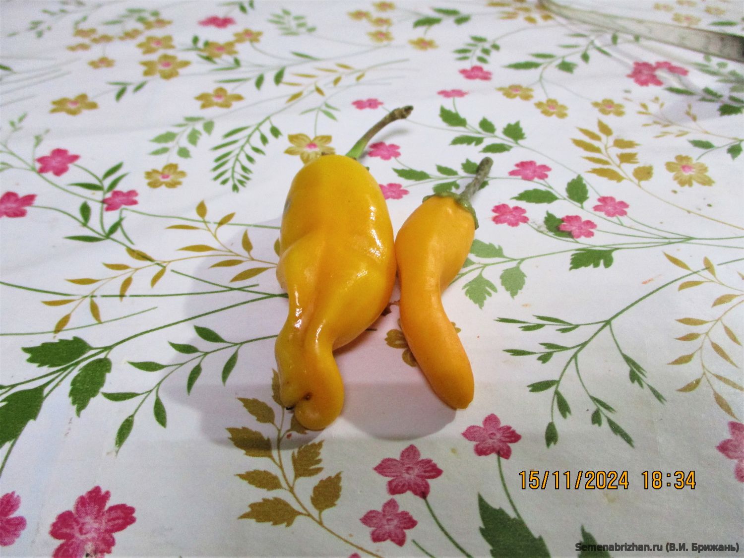 Семейство: Паслёновые (Solanaceae). Вид: Capsicum baccatum. Происхождение сорта: Перу. Неприхотливый и высокоурожайный сорт острого перца, родом из Перу, очень напоминающий популярный сорт острого перца Лимонный леденец (Lemon Drop), но значительно превосходящий его по высоте и размеру плодов. Плоды длинные, формы искривленного конуса, ярко-жёлтого цвета. Вкус фруктовый, сладкий, тропический, с ананасовой сладостью и терпким ароматом чили. Используется для свежего потребления, соусов, маринадов и сушения. Острота по шкале Сковилла: 20000-30000. Срок созревания: 120-140 дней. Высота растения: 150-170 см. Длина плода: 7-10 см.