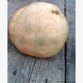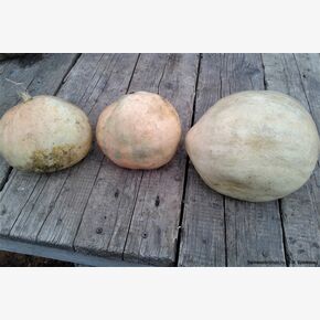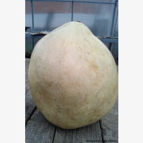 Коллекционная реликвия. Новейший, экстравагантный сорт гибрида тыквы и арбуза, полученный в Институте молекулярной биологии и генетики Украины в конце прошлого века. На Украине арбуз называют кавуном, а тыкву - гарбузом, вот отсюда и пошло его название. Этот гибрид тыквы и арбуза унаследовал характерные особенности обоих родителей, по урожайности превышая их на 20-30 процентов. Растение раннеспелое 60-70 дней. Стебель кавбуза стелющийся, полый, ветвистый, достигает 4х метров в длину, мощное, густо-облиствлённое, имеет 4-6 боковых побегов второго порядка и 1-2 побега третьего порядка. Листья крупные, слабовыемчатые, сердцевидно-округлые, на средней длины черешках, с незначительным опушением. Цветки крупные, оранжево-желтые. Внешне кавбуз более напоминает тыкву. Плоды округло-вытянуто-куполовидные, кремово-голубоватые, слабо сигментированные, окраска фона коры различной интенсивности, с зелёным налётом и сетчатым беловатым вкраплением, средний вес плодов составляет где-то 3 -15 кг. По вкусу растение ближе к арбузу (вкусный,ароматный и сладкий). На одном растении образуется три-четыре плода с тонкой крепкой кожурой, оранжевой суховатой мякотью толщиной 4-7 см.Плоды его приятны на вкус, используются в пищу, на корм скоту и птице. Богаты каротином, содержат до 15 процентов сахара, преимущественно фруктозы, а также пектин, белки, витамины В, С, РР, Е. Из минеральных солей в них присутствует калий, кальций, магний, железо, кобальт и др. Семена длиной 3-4 см, овально-вытянутой формы, желто-белой окраски, напоминают семена арбуза и тыквы. Ценен отличным вкусом и долгим периодом хранения, может лежать хоть до нового урожая. Несмотря на южное происхождение, сорт весьма неприхотлив и выращивается как в условиях Средней полосы, так и в более северных регионах России. Сорт отличается крайней холодостойкостью, переносит заморозки до -3 -5 С, плоды также не повреждаются слабыми заморозками.