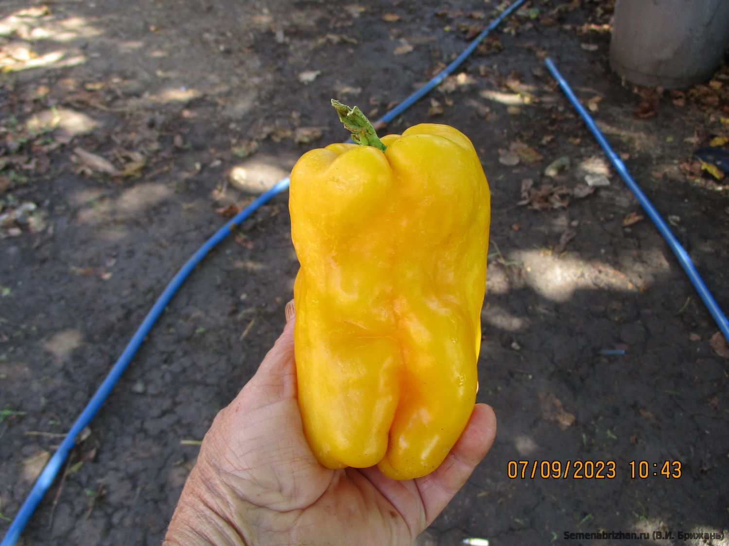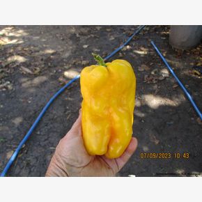 Коллекционная реликвия из США. Среднеспелый (120-130 дней) крупноплодный сорт для выращивания в открытом и защищенном грунте. Растение высотой 70-80 см, открытого типа, с крупными листьями, формирует одновременно 7-10 плодов. Плоды кубовидно-призмовидные, в технической спелости – окраска темно-зеленые, в биологической – ярко-жёлтые; кожица с глянцевым блеском, длиной 18-20 см; диаметр 12-14 см; массой 300-400 г, и более, сочные, сладкие. Толщина стенки 0,9-1,1 см. У плодов сладкий оттенок вкуса, слабая кислинка. В салатах, закусках они отлично гармонируют с другими овощами. Эти перцы удобно фаршировать, добавлять в супы, борщи, гарниры. Их замораживают кусочками, используют для приготовления соусов, заправок, лечо, айвара. Рекомендуется для рынка свежей продукции и переработки. Вкусовые качества плодов достойны самой высокой оценки! Плоды используют в свежем виде, запекают на гриле, фаршируют, замораживают, они хороши для любых видов консервации. В культивации неприхотлив, хорошо переносит экстремально высокие температуры. Лёжкость высокая. Сорт очень урожайный — до 14 крупных плодов на растении. Хорошо устойчив к тобамовирусам и вирусу бронзовой пятнистости. Выдерживают длительную транспортировку. Урожайность 8-8,5 кг/м2. Ценность сорта: устойчивость к комплексу болезней, стрессоустойчивость, высокие вкусовые качества плодов, транспортабельность, пригодность к хранению. Рекомендуется для выращивания в открытом грунте и пленочных теплицах. В пакете 20 шт. семян.