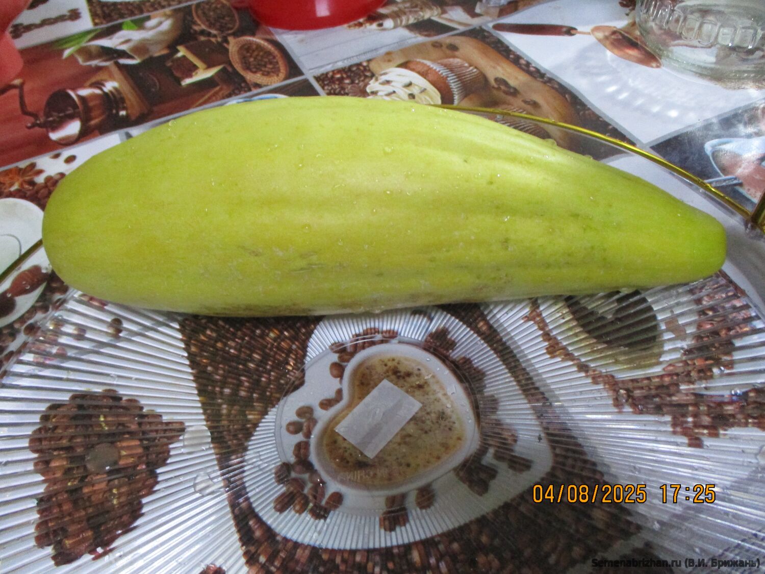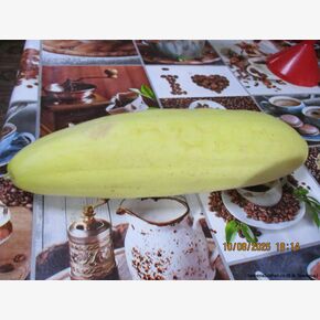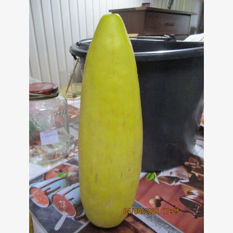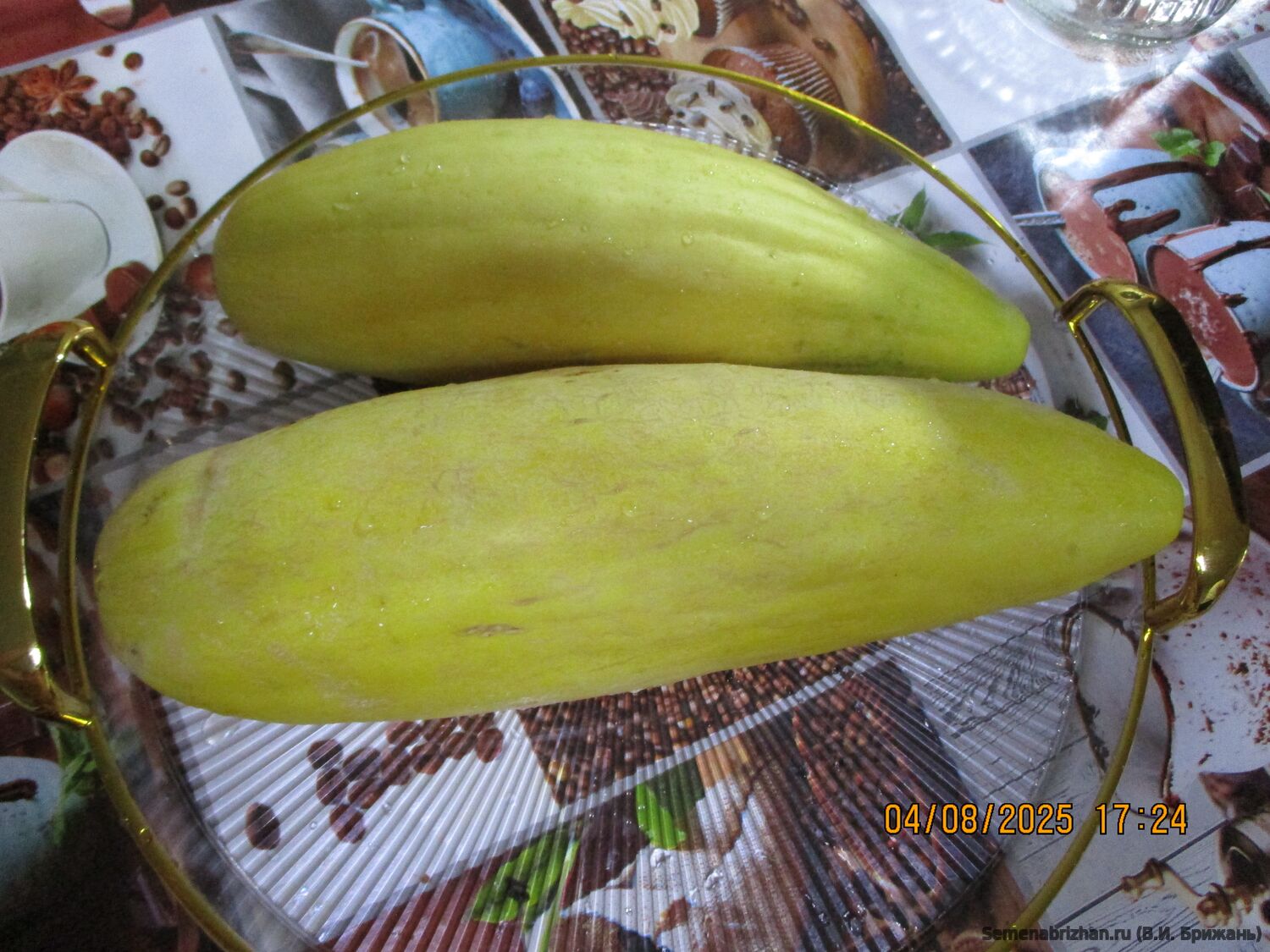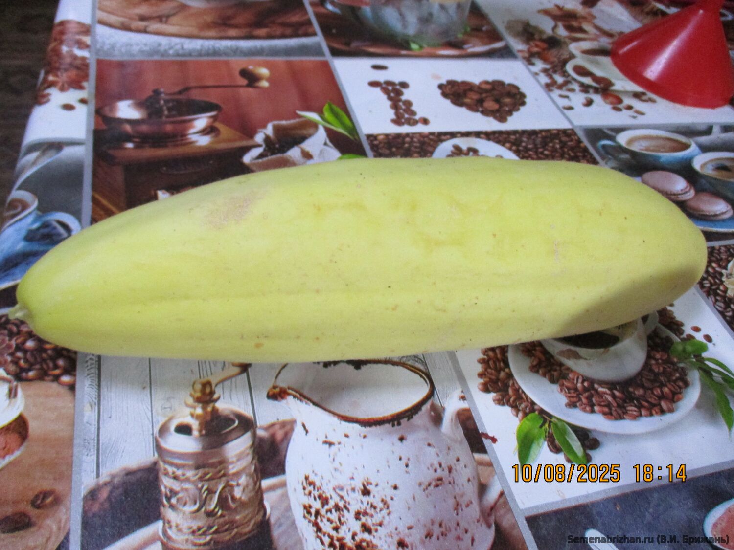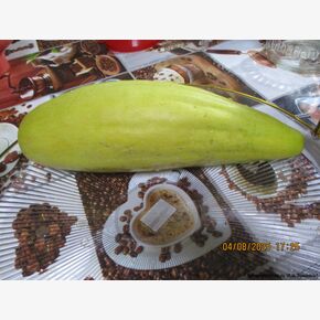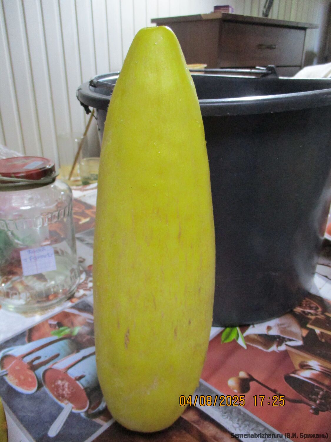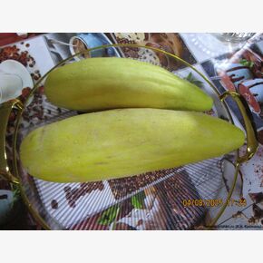 Сорт раннего срока созревания. Вегетационный период 65-75 дней. Плоды удлиненной веретеновидной формы, крупные, сегментированные, массой 1,5-3,0 кг. Окраска плода желтая с пробегающими чуть оранжевыми пятнами или полосами. Мякоть белая, толстая,4,0-6,0...