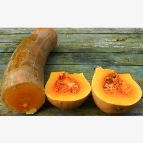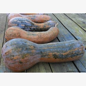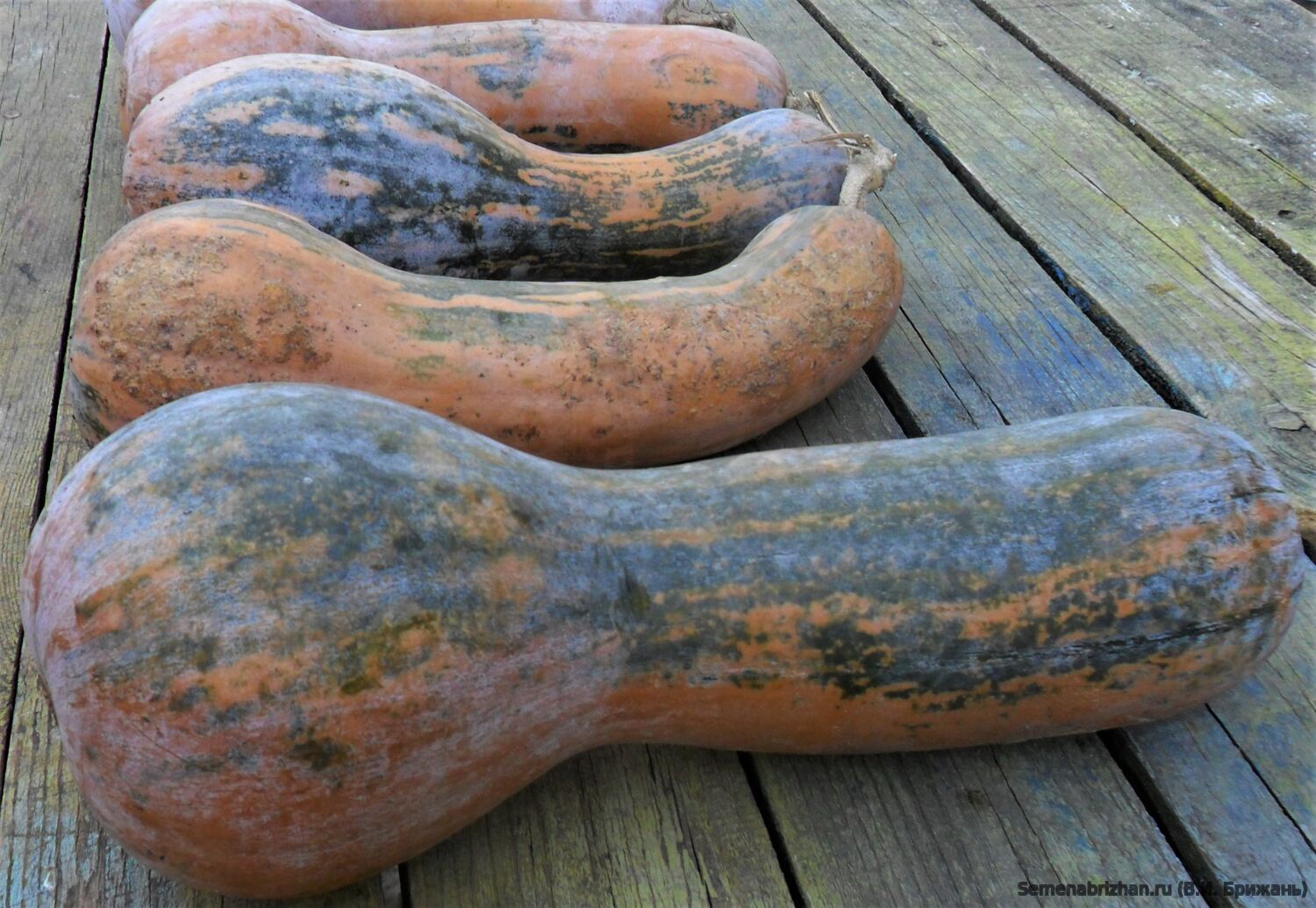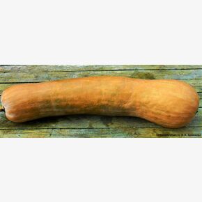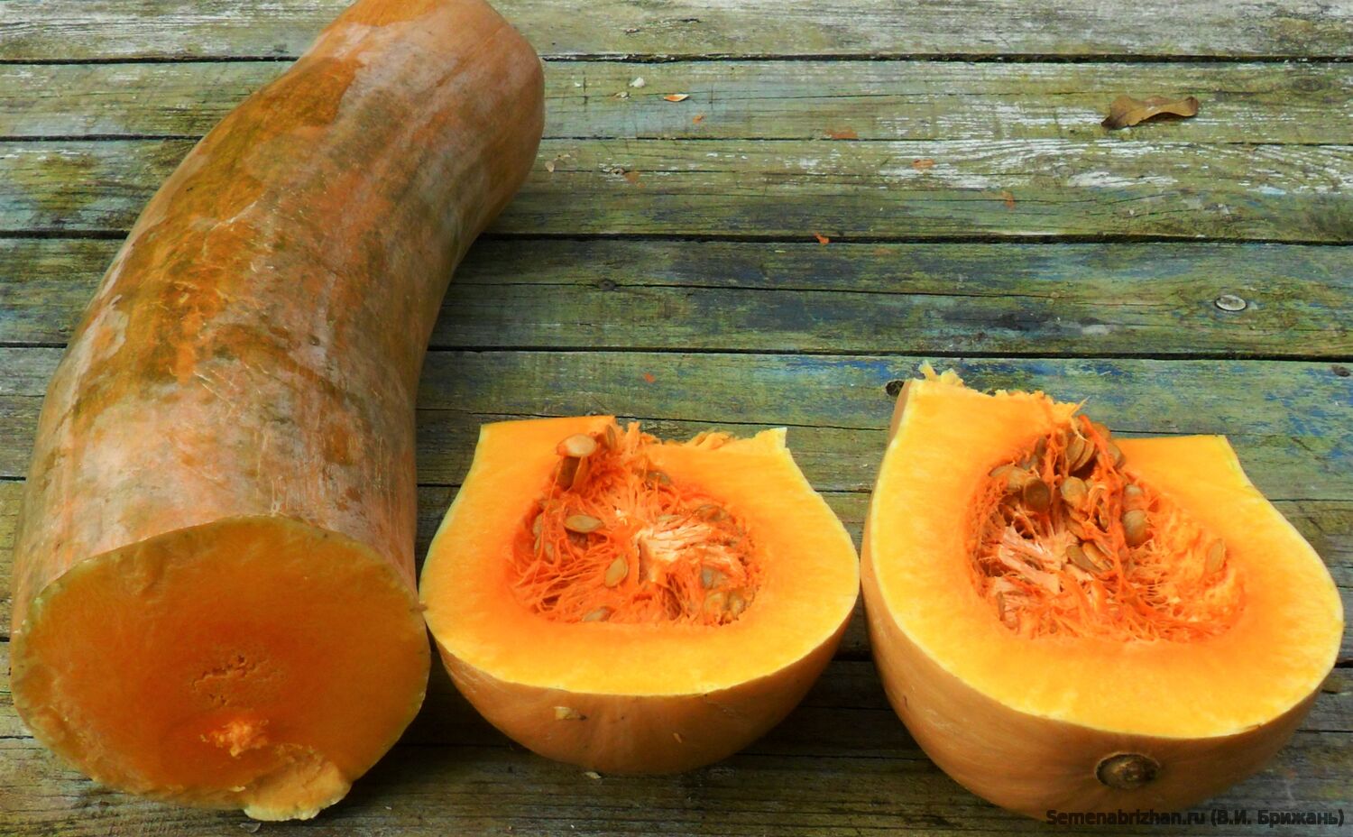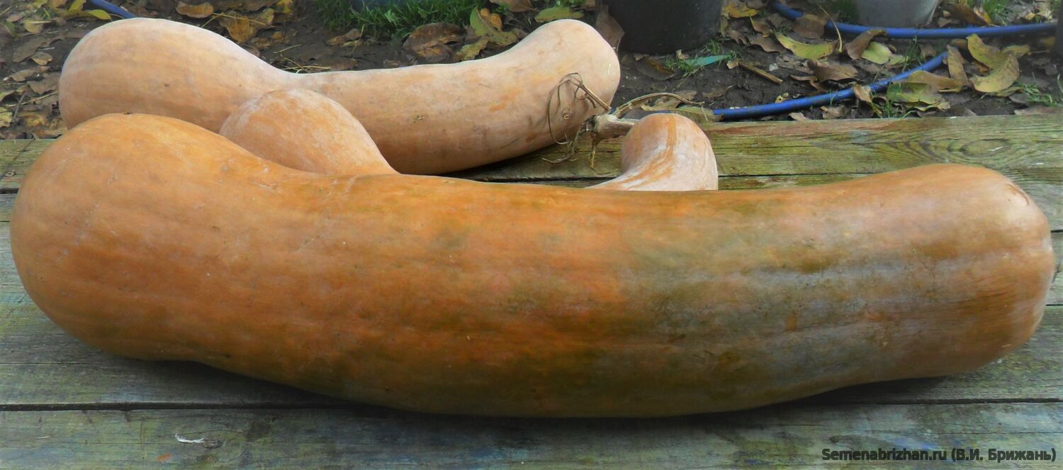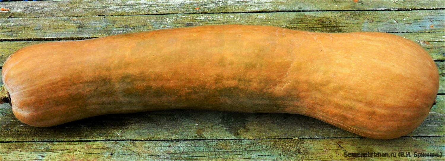 Тыква-красавица Медовая гитара - всем тыквам - тыква! Ни один другой сорт не сравнится с Медовой гитарой, она не имеет изъянов. Эта изящная мускатная тыква по форме напоминает гитару. Длина достигает 90 см. и более..., в диаметре - до 15-17 см. (зауженной части), и 19-26 см. (вздутия с семенами). Семенная камера находится в утолщённой части плода. Кожура у тыквы мягкая, хорошо режется, оранжевой или оранжево-зеленоватого цвета, массой 3-8кг. а некоторые экземпляры набирают до 10 кг. веса.