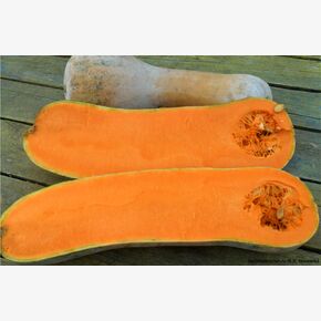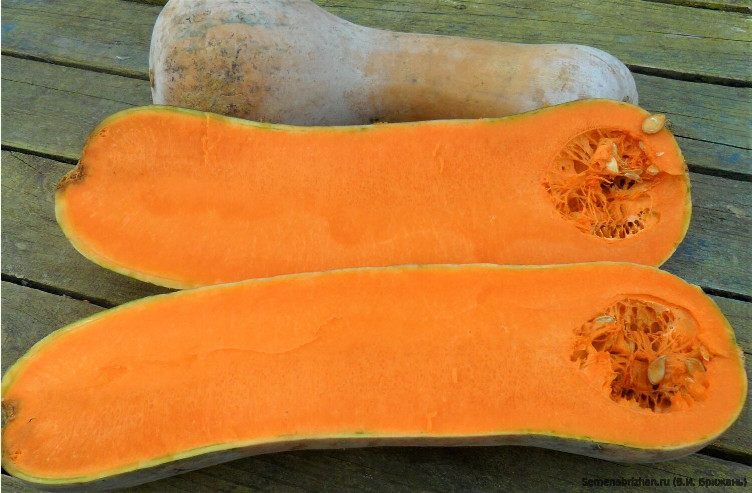 Мякоть плотная, хрустящая, сладкая, сочная, с высоким содержанием каротина. Мякоть жёлто-оранжевая, распределена по всей длине плода, составляет 90 % от объёма. Эту тыкву можно есть в сыром виде. Отрежешь кусочек, а остальная часть может лежать до тех пор, пока всю её не съешь. Хранить можно в квартире под диваном, кроватью, шкафом, у двери, на подоконнике. Может храниться до нового урожая, и чем дольше лежит, тем вкуснее становится. Гитаровидные плоды могут похвалиться отличным вкусом, присущим всем мускатным видам. В нём преобладает медовая сладость, ощущаются фруктовые и пряные нотки. Хрустящая и сочная мякоть имеет интересный морковно-абрикосовый привкус, подчёркнутый насыщенным ароматом. Дегустационный балл сорта — 4,9 из 5.Замечательной особенностью Медовой гитары является тот факт, что после термической обработки мякоть становится ещё более сладкой и душистой. В отличие от других тыкв её можно есть даже в сыром виде. Для свежего потребления лучше всего подходят тыквины, не достигшие состояния полной технической зрелости.Назначение урожая сортовой принадлежности универсальное. Сладкая мускатная тыква широко используется хозяйками в домашней кулинарии:она применима в приготовлении разных блюд (супов-пюре, гарниров, сладких каш, оладий, запеканок);на её основе получаются отличные десерты и сладкие лакомства: варенье, мармелад, джем, цукаты (особенно вкусна запеченная ломтиками тыквенная мякоть с добавлением мёда и орехов);она используется в качестве начинки для пирогов и других кондитерских изделий из теста; её перерабатывают в сок и пюре, предназначенные для детского или диетического питания;консервируют кусочками в виде ананасового компота или экзотического варенья «под манго»;подвергают заморозке, вялению, сушке. Плоды, напоминающие своей формой гитару, не только вкусны, но и полезны для здоровья едока. Это ценный пищевой продукт, содержащий малое количество калорий и обилие ценных для организма веществ. Одной его порции хватит, чтобы покрыть суточную потребность в витамине А и 1/2 нормы потребления витамина С. Медовая гитара длинно-плетистая тыква, среднеспелая - 110 - 120 дней. Растения мускатного сорта длинноплетистые (лиановидны), хорошо развитые. Характеризуются большой энергией роста. Имеют разветвлённую корневую систему, способную добывать влагу из глубин грунта и обеспечивающую хорошую засухоустойчивость культуры. Описание их внешнего вида включает в себя признаки: длину побегов — 3-5 м; мощные стелющиеся стебли с шершавой поверхностью, покрытой колющимися волосками; наличие на лианах усиков, с помощью которых растение фиксируется на опорах; листву: крупную, зелёную с узором из белесых пятен, пятилопастную, широкую; цветки: большого размера (их диаметр — до 10 см), жёлто-оранжевые, воронковидной формы. В пакете 5 шт. семян.