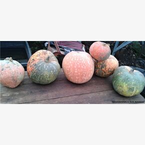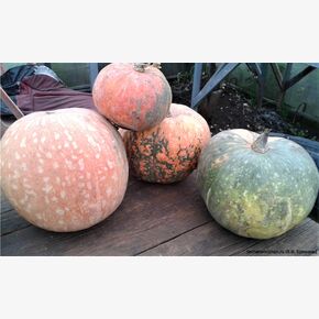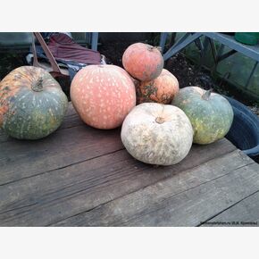 • Молекулярный гибрид арбуза и тыквы, унаследовавший характерные особенности обоих родителей, а по урожайности превышающий их на 20-30%, с очень высоким урожаем и несколько неплохим качеством мякоти, столового назначения. Кавбуз был получен  при помощи действия препаратов нуклеиновых кислот тыквы и арбуза в Институте молекулярной биологии и генетики Национальной академии наук Украины. Занесен в Государственный реестр сортов Украины. Растение это похоже на тыкву и очень теплолюбиво. Урожай созревает через 100-120 дней после появления всходов. Растение мощное, длинноплетистое – стебель кавбуза стелющийся, полый, ветвистый, достигает до 4 метров в длину. Листья крупные, слабовыемчатые, с незначительным опушением. Цветки крупные, оранжево-желтые. Плоды средние, сверической округлой формы, кора тёмно-серо-голубого цвета, с тускло-красно-розовато-оранжевым оттенком и белыми вкраплениями, массой 3-5 кг. Кора гладкая, толстая. Семенное гнездо малое. Мякоть толстая, до 5 см, хрустящая, сладкая, очень плотная, отличного благородного качества. Кожа тонкая и крепкая, из-за чего очень хорошо хранится очень долго, практически до мая месяца. Мякоть красноватая,оранжевая сладкая, плотная и хрустящая, с  утончённым дынно--мускатно-арбузным  ароматом. Сорт отличается высокими вкусовыми качествами, устойчивый к комплексу болезней культуры. Подходит для приготовления сока, джема с добавлением цитрусовых, цукатов, запекания - в запеченном виде без сахара -  прибавляется ощутимо сладость, текстура нежная, не волокнистая, вкусная,  а так же употребляется в сыром виде - свежие витамины всю зиму. Хорошо вызревает в любых регионах, холодостойкий и жароустойчивый сорт.  Отлично хранятся и транспортируются. Семена у кавбуза овально-вытянутые, желтовато-белые, или оранжевые, панцирные, длиной 2-3 см, напоминают семена арбуза и тыквы. Перед посевом семена замачивают в воде комнатной температуры, а потом выдерживают в теплой влажной среде еще 2-3 дня. Посевные ямки размещают на расстоянии 70-100 см одна от одной. Расстояние между строками 1,2-1,8 м. Почва перед посевом должна быть прогрета до температуры не менее 12-15°С. В пакете 5 шт. семян.