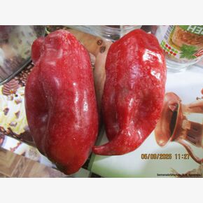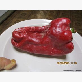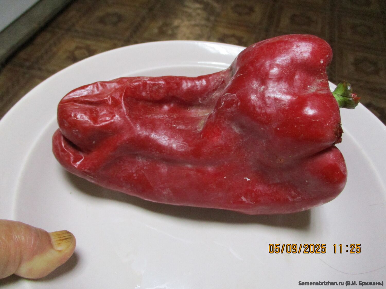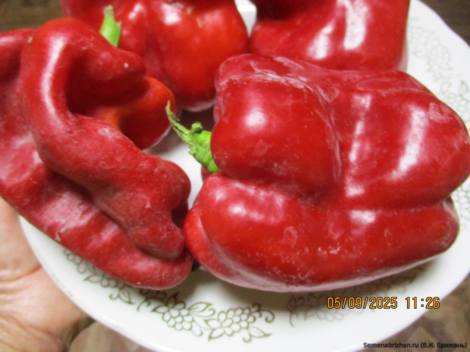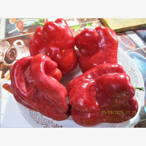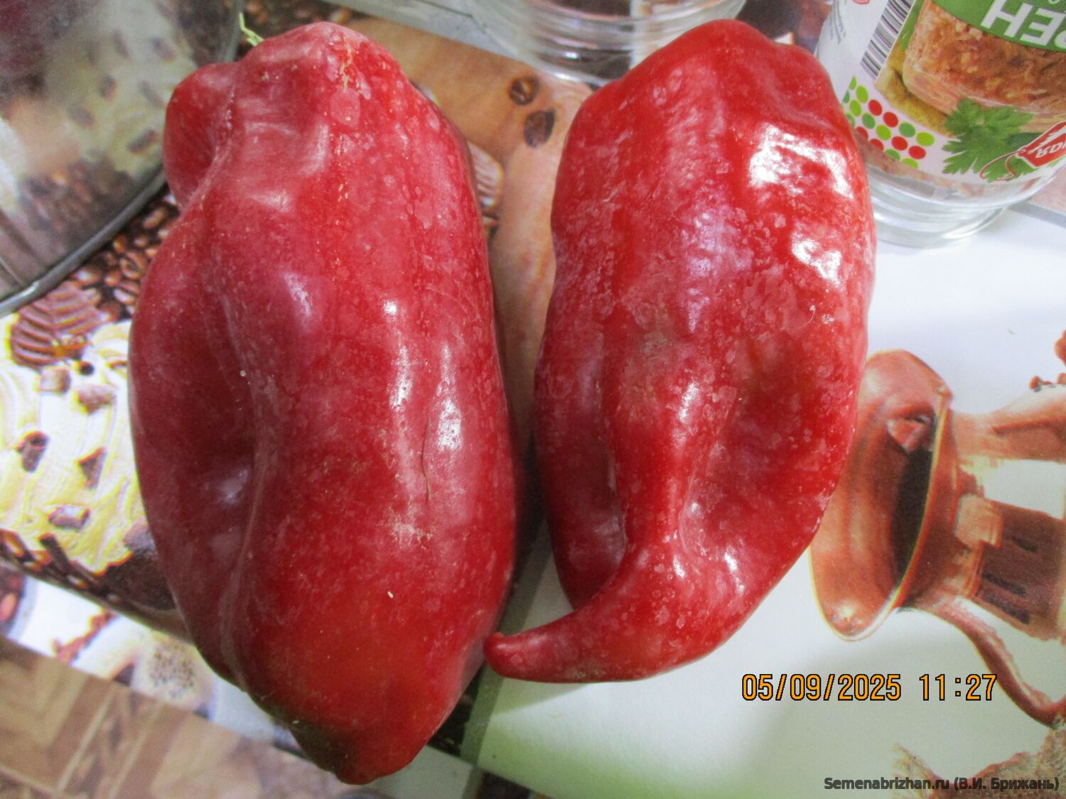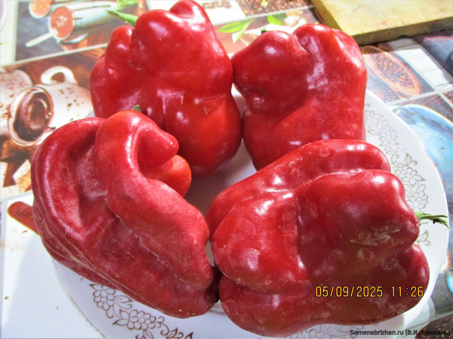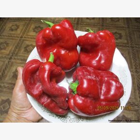 Интересный, великолепный, коллекционный, раннеспелый (80-90 дней) сорт сладкого перца народной селекции. Растение: Высокорослое, до 1 метра, требует опоры и формирования, полураскидистое. Плоды:Форма: Крупный куб или куб-конус, призмовидный. Размер: Очень крупные, до 10-12 см в длину, 15 см в диаметре. Вес: 180-300 гр, иногда до 400 гр. Стенка: Толстая, мясистая, до 1.2 см. Цвет: В технической спелости зелёный, в биологической — насыщенно-красный. Вкус: Очень сладкий, сочный, ароматный, с приятной свежестью. Урожайность: Высокая, высокоурожайный. Использование: Универсальный: идеален для салатов, приготовления соусов, консервации, заморозки и фарширования. Мякоть ароматная, сочная, хрустящая, сладкая, с фруктовыми нотками. Используется для потребления в свежем виде, консервирования, фарширования, для засолки, для ярких летних салатов, супов и нарезки, для ароматного лечо. Из мякоти можно готовить соусы, супы, добавлять в рагу или в свежий витаминный салат. Хорошо сладкий пикантный перечный вкус сочетается с мясом, курицей или рыбой, а еще перчики отлично переносят заморозку. Выращивание: Предпочитает солнце, плодородную, влажную почву. Выращивается рассадным способом (посев в марте-апреле). Высадка в грунт/теплицы после угрозы заморозков.Требует опоры, подвязки и формирования куста. Этот сорт устойчив к перепадам температур и нетребователен к качеству грунта, однако лучше всего растет на солнечных участках. Овощ надежно противостоит вирусу табачной мозаики, но может поражаться проволочником, клещами, тлей. Наибольшие урожаи достигаются при ведении тепличной культуры. Ценность сорта: устойчивость к вирусу табачной мозаики, вершинной гнили, выносливость к колебаниям температуры, высокие товарные качества плодов. В пакете 5 шт. семян.