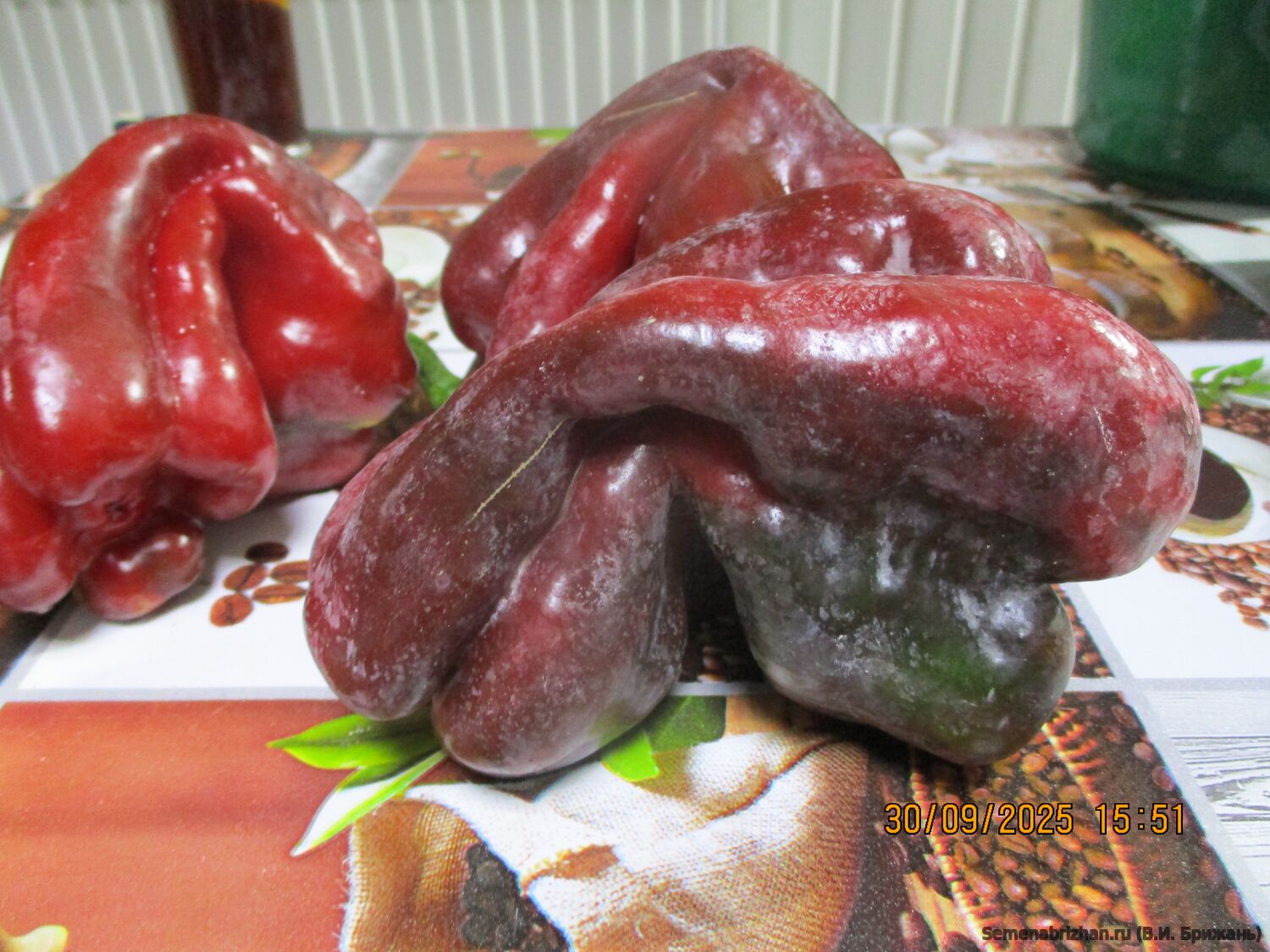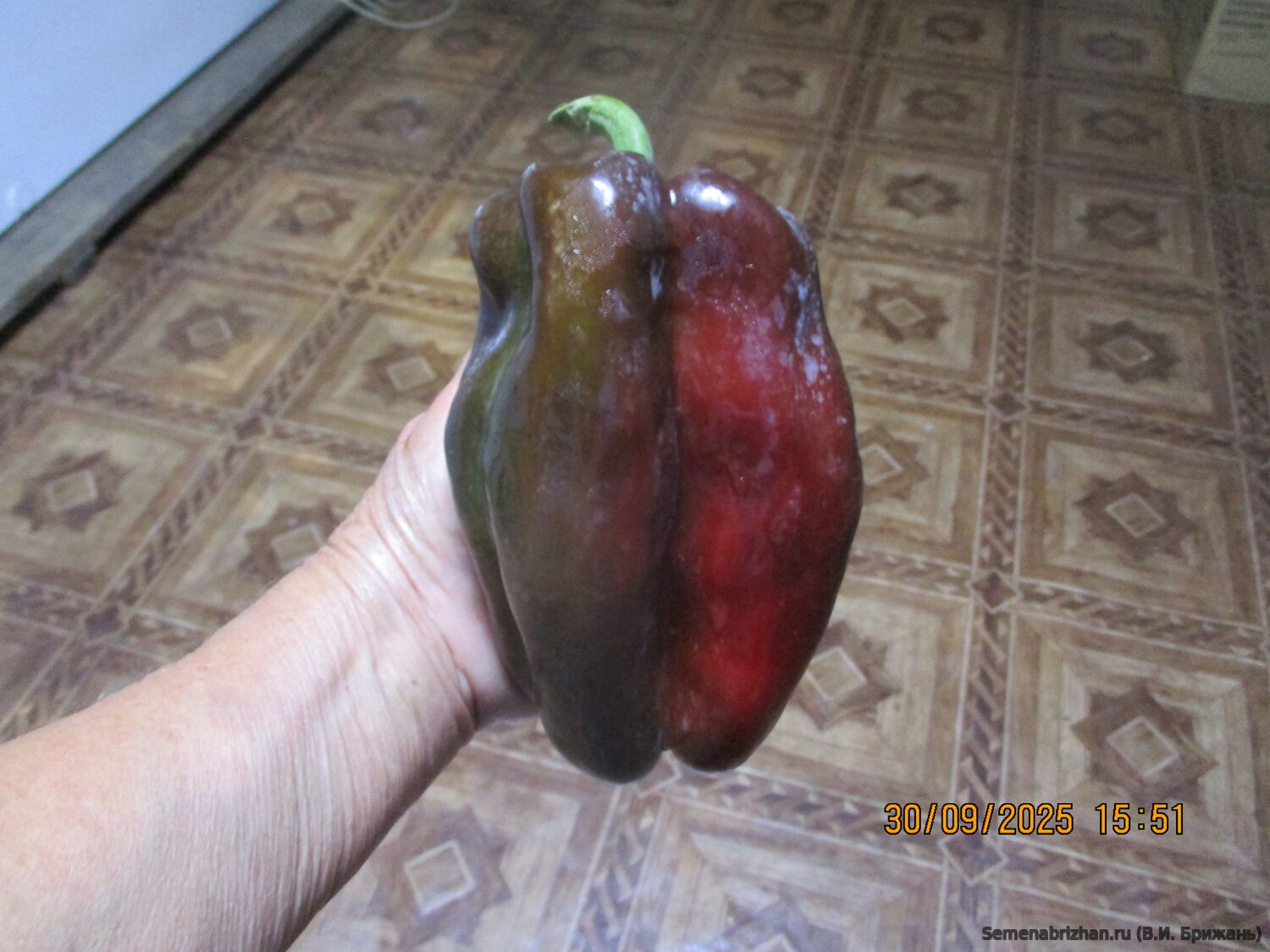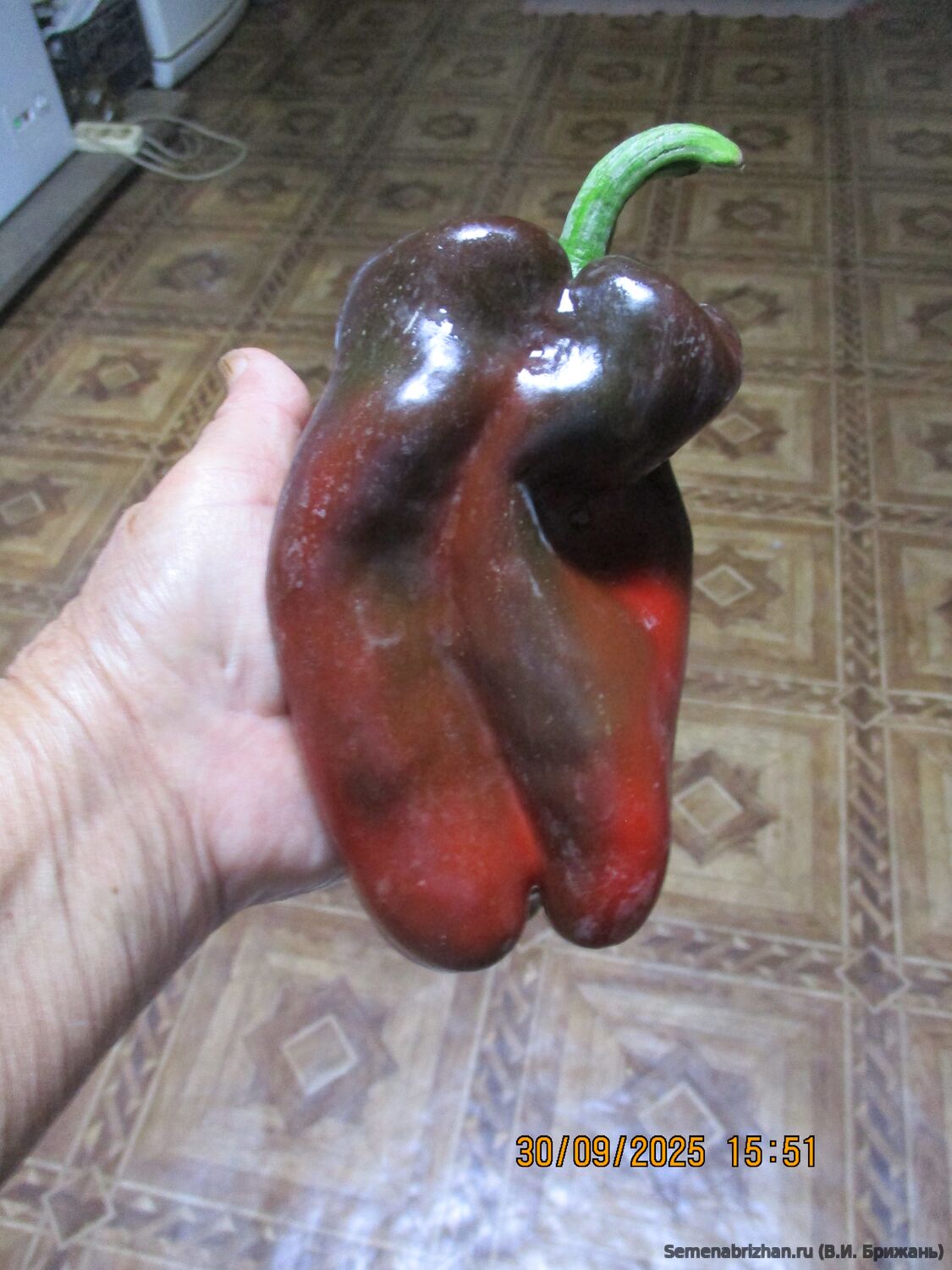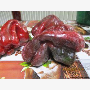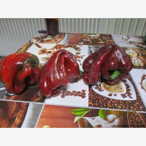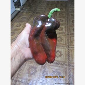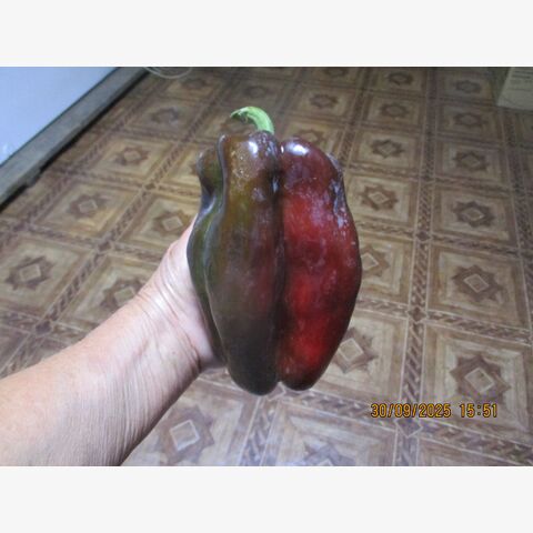 • Новый достаточно редкий коллекционный сорт из США,  среднеспелый (120-130 дней) урожайный сорт сладкого перца. Рекомендуется для выращивания в пленочных и остекленных теплицах. Растение высокое,около одного метра, раскидистое, хорошо облиственное, мощное,с крупными листьями, плодовитое. Плод гигантский, пониклый, удлиненно-кубовидно-призмовидный, массой 280-560 г, длиной 14-25 см, диаметром 8-9 см, число камер 3-4, толщина стенки 9-1,2 мм. Окраска незрелого плода - тёмно-зеленая, зрелого насыщено-бордово-красная, глянцевая, с сочной сладкой хрустящей и ароматной мякотью. Используются для приготовления салатов, супов, маринования. Плоды с очень сочной, ароматной мякотью и сильным перечным ароматом и с повышенным содержанием аскорбиновой кислоты, идеальны для фарширования, для приготовления лечо, для консервирования, запекания и замораживания, употребления в свежем виде и переработки. Перец очень вкусный и сладкий. К съёму бывает готов в тот момент, когда плоды начинают глянцевито поблёскивать. При длительном хранении не теряет упругости и вкусовых качеств. Урожайность в теплице 12-14 кг/м2, схема посадки 60х60 см. В теплице куст формируют в два стебля. Сорт ценится за повышенную лежкость и транспортабельность, отличные вкусовые качества. Плодоношение длительное и обильное.  Устойчив к тобамовирусам и бронзовой пятнистости. Рекомендуется для выращивания в теплицах и открытом грунте. Сорт устойчив к вирусу табачной мозаики. Характеризуется высоким содержанием сахаров и витаминов. Сорт урожайный, устойчивый к болезням, низким температурам и малой освещенности. Высокий потенциал урожайности. В пакете 20 шт. семян.