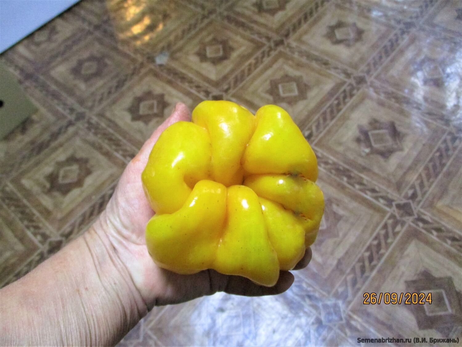 Агротехника: как для красного, так и для жёлтого. Тип роста: Детерминантный, штамбовый, компактный куст 70-80 см. Созревание: Среднеранний. Плоды: 120-250 гр. (до 400 гр.), кубовидные, жёлтые, толщина стенки 6-8 мм. Наш совет: Все правила, выведенные для красного гиганта, работают и здесь: надёжная подвязка тяжёлых веток, регулярный полив без пересыхания и максимум солнца для сахаристости. Сорт проверен в нашем климате и показал себя отлично.