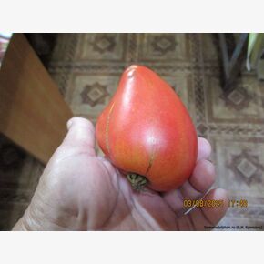 Старый коллекционный Испанский сорт. Индет. Среднеспелый. Кусты (1,5–2 м). Тонкое строение куста. Плоды алло-розовые выровнено овально - сердцевидные, на кустике почти все одинаковые, глянцевые как отполированные, с плотной сладкой мякотью, малым количест