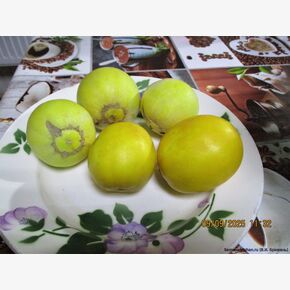 Семейство: Тыквенные (Cucurbitaceae). Вид: Cucumis melo. Происхождение сорта: Китай. Редкий неприхотливый коллекционный старинный среднеранний сорт дыни малышки родом из Китая. Выведен научно-исследовательским институтом Сельскохозяйственного университета Ганьсу на основе сортов Медовая белая и мексиканского сорта Манна. Эту дыню массово выращивают в аграрном районе Миньцинь городского округа Увэй провинции Ганьсу. Срок созревания: 105-120 дней (35-40 дней после завязывания плодов). Компактный куст с плетями средней длины легко разместится даже на небольшом участке. Плоды лёжкие небольшие округлые, весом около 200 - 500гр,. Кора ярко-жёлтого цвета, из-за чего её иногда называют Золотая дыня. Мякоть белая с нежным оранжево-розовым оттенком сочная, плотная, очень сладкая и ароматная. Кожица очень тонкая, чистят ножом как яблоко. Хороша, как в свежем виде, так и для варенья и других кулинарных изделий. Из зрелых плодов получается очень душистое варенье, пастила и повидло, а также другие сладкие, кондитерские изделия. Истинное лакомство для детей и взрослых. Обладает огромной урожайностью. Болезнестойкий, холодостойкий, засухоустойчивый и высокоурожайный вид. Семена можно сразу сеять в открытый грунт в конце мая или первых числах июня. На рассаду нужно выращивать в теплице или в парнике. Проросшие семена высаживают в ёмкости с заранее подготовленным грунтом из смеси торфа, песка и дерновой земли. В каждой ёмкости должно быть два или три семени. Далее их посыпают слоем песка и поливают тёплой водой. Когда появляются всходы, температуру в теплице или парнике можно уменьшить на несколько градусов, что поможет избежать вытягивания растений. Поливать рассаду нужно аккуратно - не слишком часто и не слишком обильно. Прищипывать растения нужно в фазе трех настоящих листьев. Рассада готова к посадке в открытый грунт в возрасте 25 дней. Высаживают её в предварительно подготовленные лунки, расстояние между ними должно составлять, в среднем, около 70 см. В пакете 5 шт. семян.