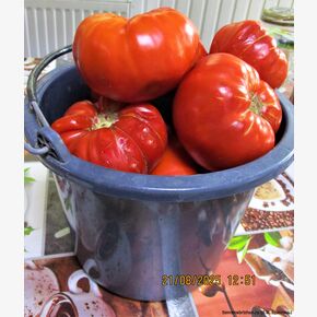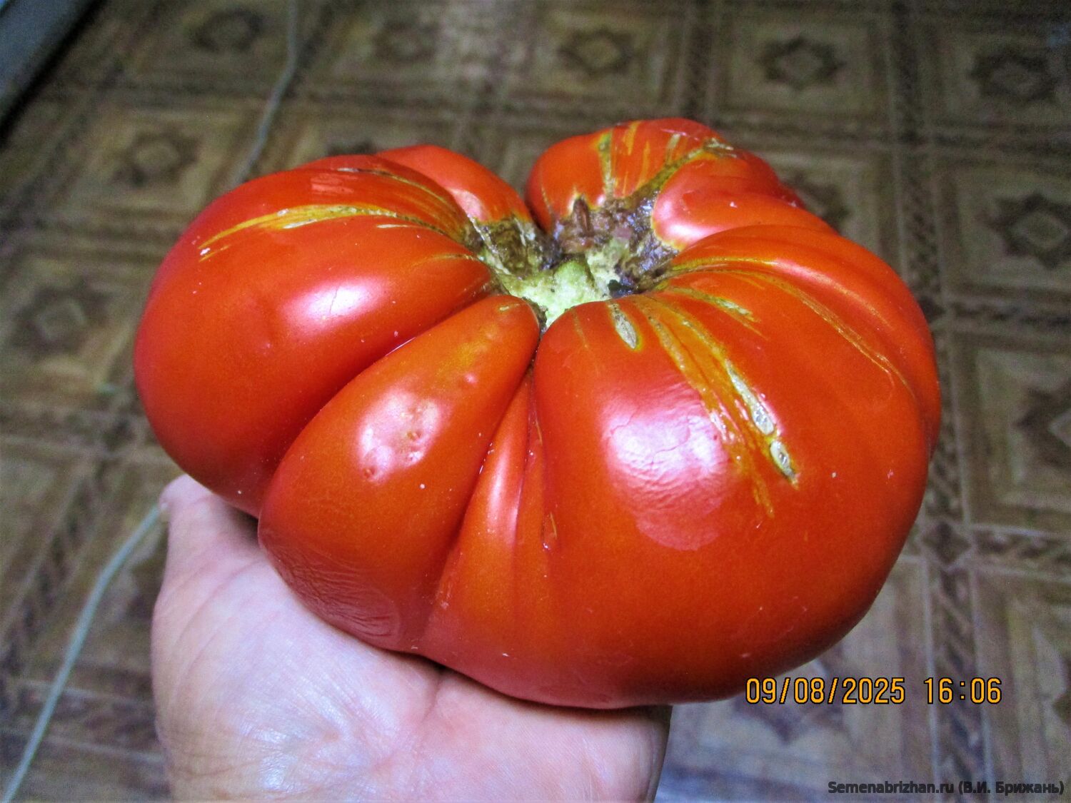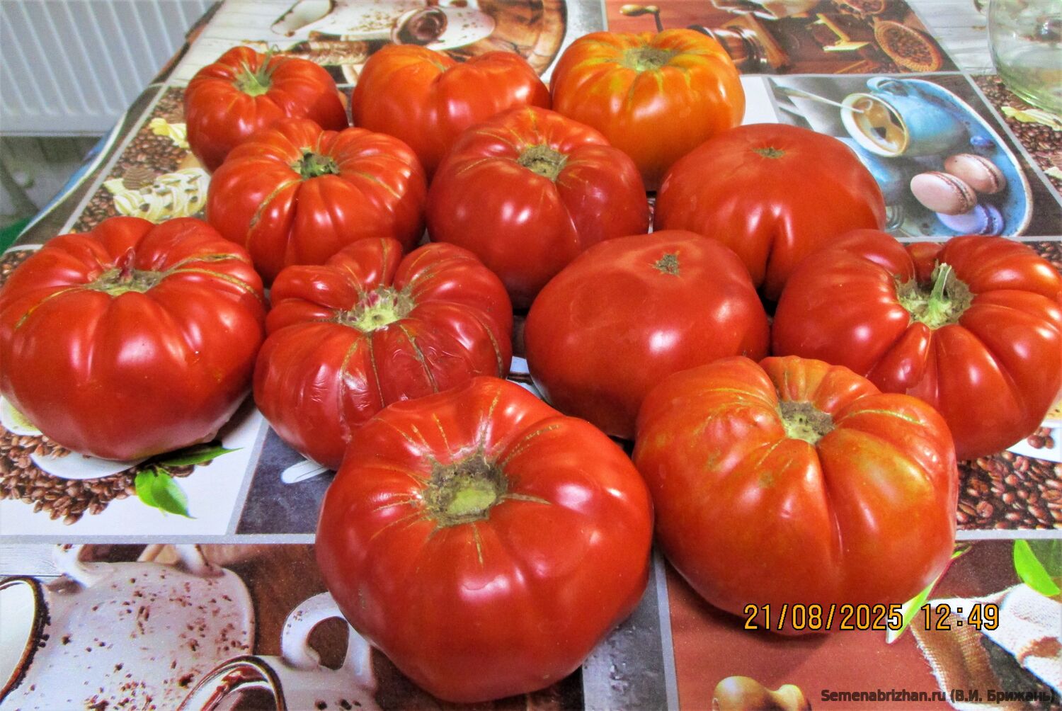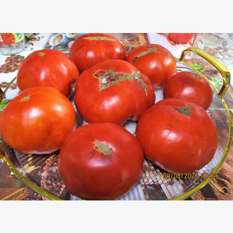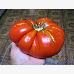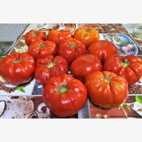 Томат "Царский любимец" относится к элитным коллекционным сортам. Он был выведен для любителей больших, вкусных, мясистых плодов. Сорт томата Царский Любимец создан в 2013 г. Над ним работали селекционеры компании «Биотехника». Агрофирма является оригинатором Любимца. "Царский любимец" считается высокорослым сортом, однако в теплице его высота около полутора метров, а в открытом грунте кусты вырастают мощными до 1 м. Именно в условиях открытого грунта он оказался самым урожайным. Высокий урожай обеспечивается тем, что плоды растут гроздьями от 3 до 5 штук. Ценится за крупноплодность (300-800 г, до 1 кг) и мясистость. Плоды плоскоокруглые, ребристые, красно-оранжевого или малинового оттенка, отличного сладкого вкуса, подходят для салатов и переработки. Ещё высокий урожай достигается благодаря растянутому периоду плодоношения. В сезон мы срывали плоды полностью три раза, и после каждого раза они нарастали снова. И уже осенью, когда другие сорта давно распрощались с урожаем, на "Царском любимце" листья оставались зелеными и на кустах ещё были плоды. Листья у сорта картофельного типа. Формировать растения в открытом грунте можно в три стебля, а в теплицах в два стебля, удаляя лишние пасынки. "Царский любимец" имеет хорошую устойчивость к болезням, а также он устойчив к разным погодным условиям. Еще одно достоинство этого сорта - плоды. Если кратко, они большие, красивые и вкусные. Такие томаты называют "бифштексными" за схожесть мякоти с сочным плотным мясом. Плоды подходят больше для свежих салатов, а также для приготовления сока, соусов, томатной пасты и пюре. Плоды красивые, кожица у них блестящая, цвет от красно-оранжевого до малинового. Мякоть занимает почти всё пространство плода. Семенные камеры очень маленькие. Мякоть сочная, красивого темно-малинового цвета и очень вкусная. Имеет гармоничный сладкий вкус с легкой приятной кислинкой. И ещё мякоть имеет выразительный аромат, которым могут похвастаться далеко не все сорта. В пакете 20 шт. семян.