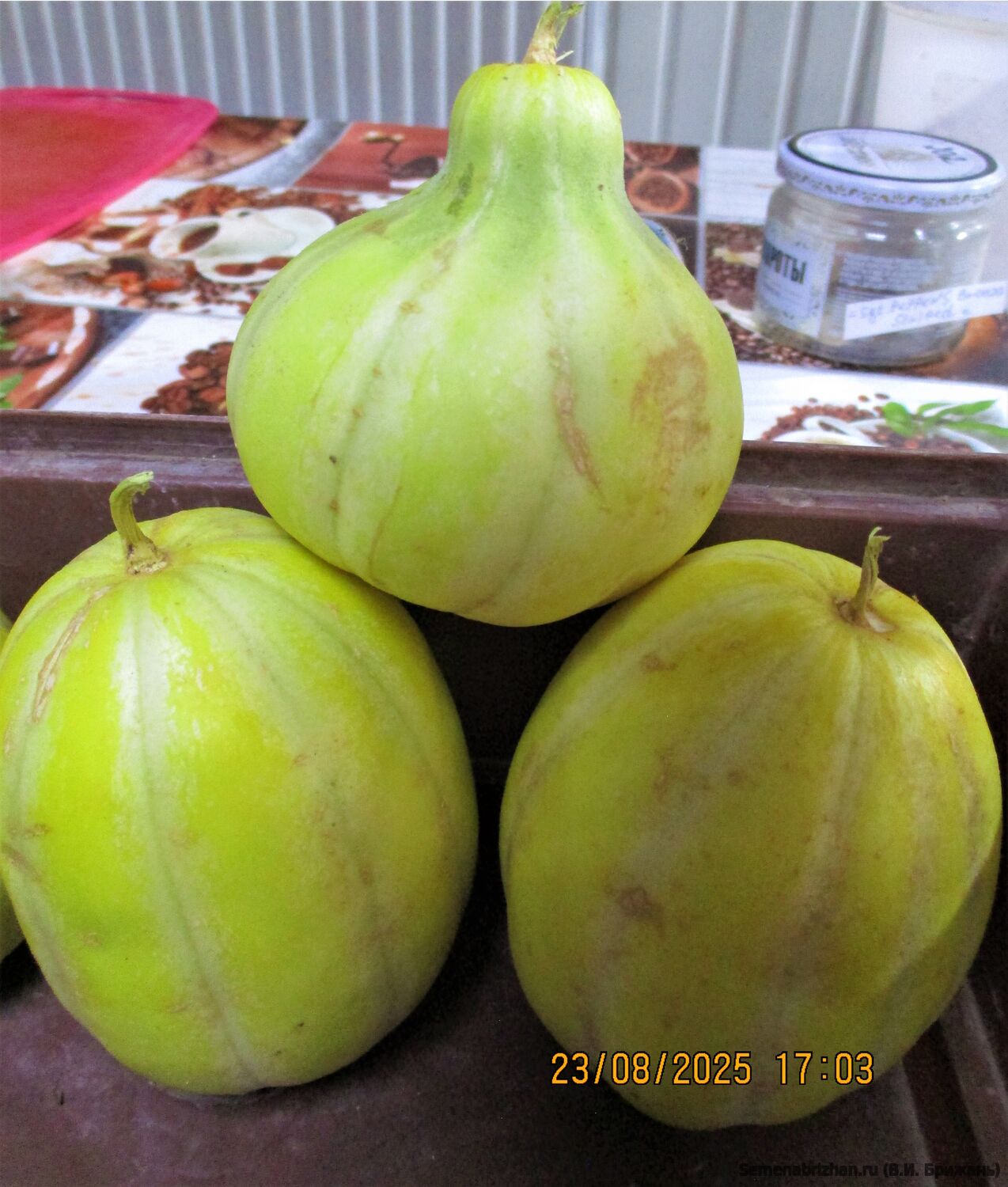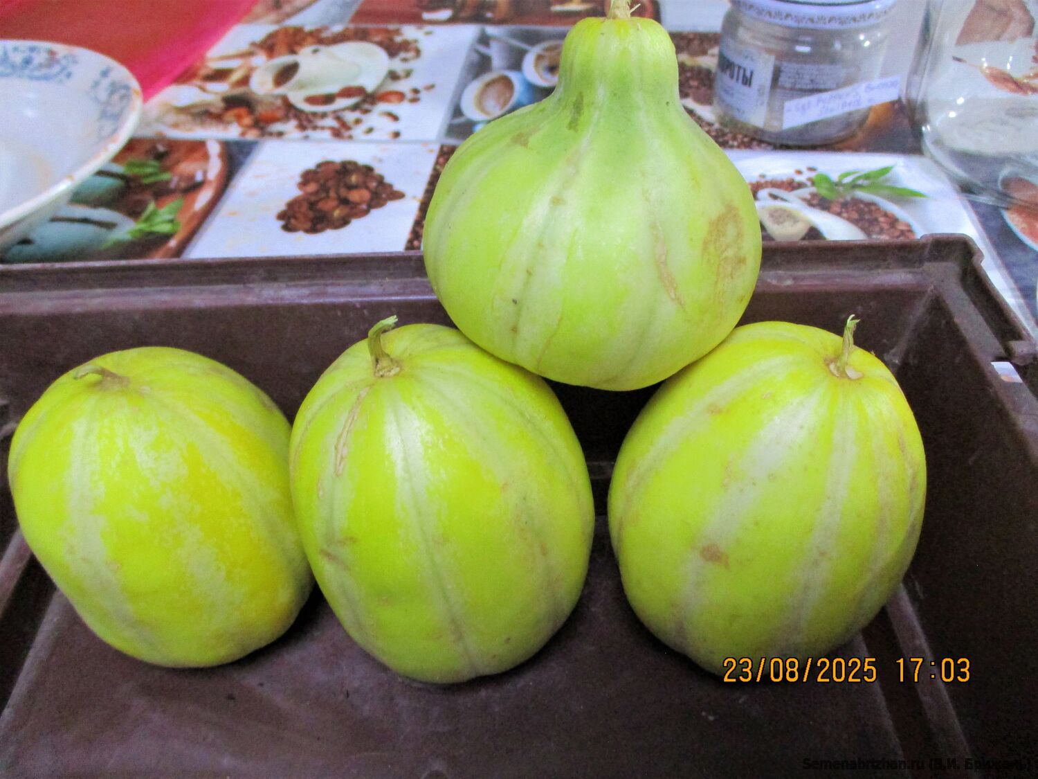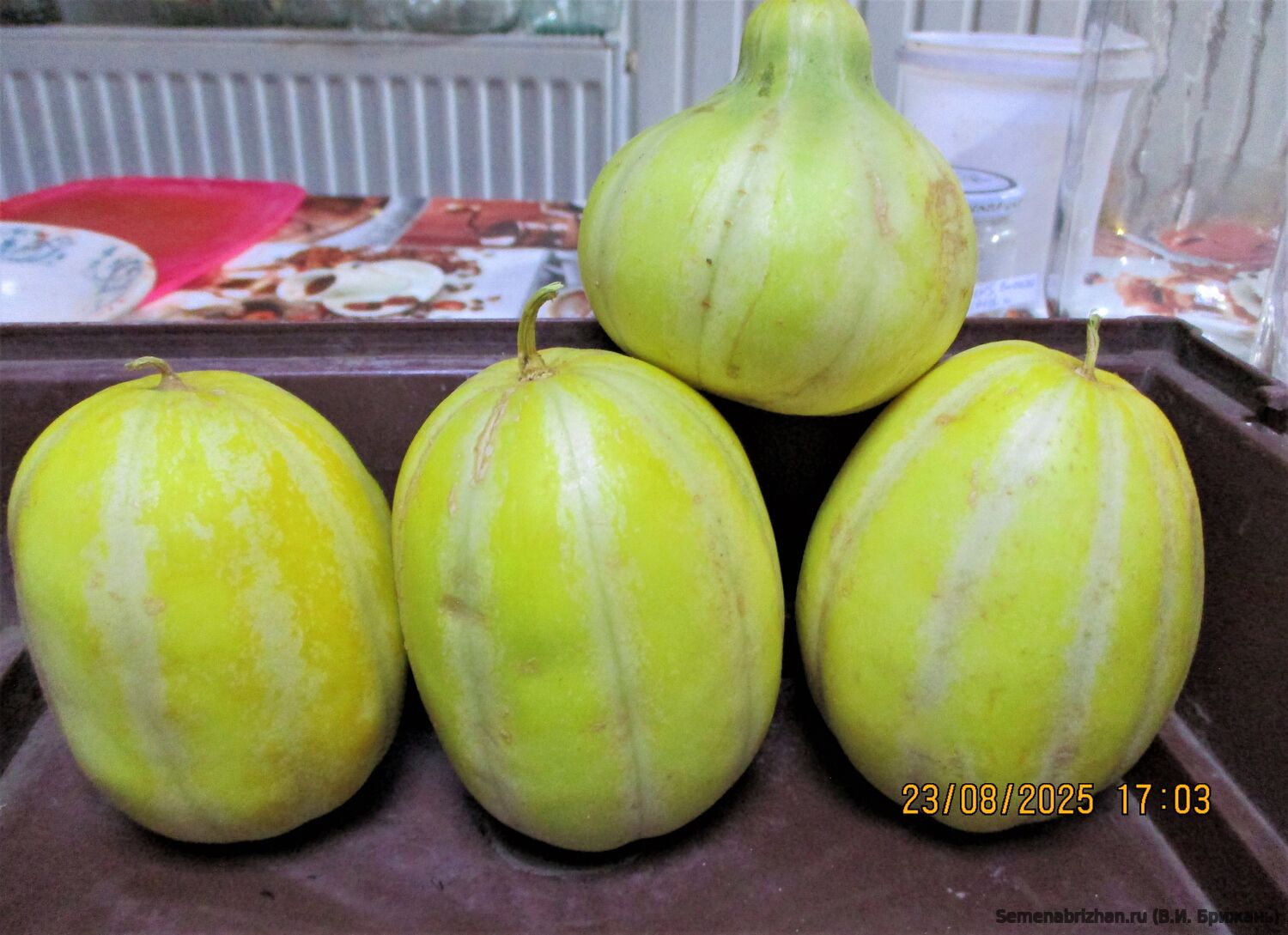 Редкий коллекционный сорт дыни, старинная семейная реликвия родом из Днепропетровска Украина. Это редкая экзотическая дыня-малышка, получившая название за характерный вкус и аромат, напоминающий знаменитую грушу. Дыньки созревают через 45 дней. Растение длиной до 4 метров, с короткими плетями 2-3 порядков. Плоды округло грушевидные, средний размер дыни 14 см на 5 см. жёлто-полосатые, массой до 800г. У самой дыни – красивая золотая окраска, иногда – со слабым оранжевым оттенком. Мякоть светло-зеленая, очень сладкая, отличного вкуса, напоминает груши, обладает сильным пряным ароматом, с ванильным привкусом, ароматная. Вкус и аромат: мякоть очень сладкая, с выраженным пряным ароматом, ванильным привкусом и нотками груши. Кожица очень тонкая, как у груши, плод можно есть не очищая. Из зрелых плодов получается очень душистое варенье, пастила и повидло, а также другие сладкие, кондитерские изделия. Это растение пригодно для выращивания и в собственной теплице, и в обычных условиях (открытый грунт). Среди характерных особенностей этого сорта можно выделить стойкость к низким температурам, а также хорошую переносимость неблагоприятных условий. Ценность сорта: продолжительное плодоношение, устойчивость к настоящей и ложной мучнистой росе, перепадам температуры. В пакете 5 шт. семян.