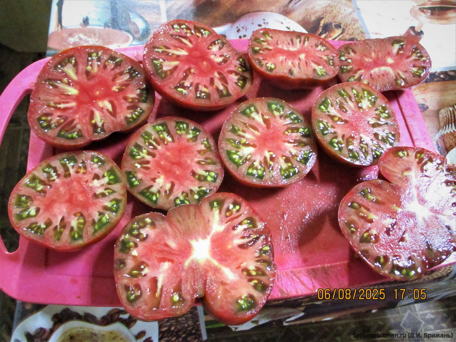 Первый ранний шоколадный глянцевый сорт - 90-105 дней), салатного назначения для открытого грунта и пленочных теплиц. Куст мощный, 1,7 м. в ОГ, вяжет хорошо, в кисти по 3-4 плода весом 200-250 грамм. Плоды плоскоокруглые, часто с небольшой ребристостью у плодоножки, средней массой 180-300 г., при хорошем уходе могут достигать до 400-600 г. незрелые - зеленые с темно-зеленым пятном, зрелые - красно-коричневые, с нечёткими зелёными полосками и с тонкой кожурой, мясистой, сочной, мякотью с высоким содержанием сахаров.Безумно красивый насыщенный коричнево-бордовый оттенок и абсолютно глянцевая поверхность! Блестят, как натертые воском, можно увидеть свое отражение. В разрезе шоколадная мякоть, с мелкими семенными камерами, очень сочная, с пряным, слегка дымным ароматом. Вкус очень сладкий, сочный, насыщенный с нотками сладости и аромата, тающий во рту. Вкусный и красивый! Высший балл по всем критериям! ЛЮБИМЕЦ! Настоятельно рекомендую! Они могут добавить интересный оттенок в кулинарные блюда и салаты. Применение: Этот сорт томатов хорошо подходит для употребления в свежем виде, а также для приготовления различных блюд. Его необычный цвет может придать оригинальность и эстетичность вашим блюдам. Урожайность составляет 7-8 кг/м2. Ценность сорта: устойчивость к основным заболеваниям, крупноплодность, отличный вкус, высокая декоративность плодов. Идеален для приготовления свежих салатов, сока и переработки на томатопродукты. Выращивание: Может быть выращен, как в открытом грунте, так и в горшках. Он предпочитает солнечное местоположение и регулярный полив. Семена этого сорта можно приобрести у специализированных поставщиков семян. «Шоколадная Амазонка» — это отличный выбор для тех, кто ищет необычные и интересные сорта томатов. Как для своего сада, так и для кулинарии. Ее уникальный цвет и хороший вкус могут добавить визуальный и вкусовой интерес к вашим блюдам.В пакете 20 шт. семян.
