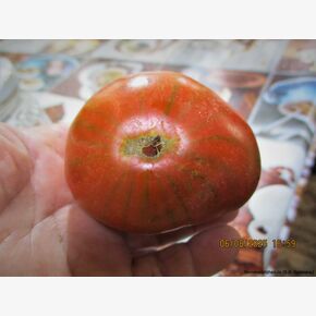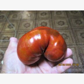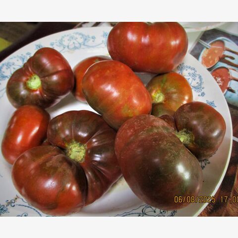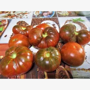 Первый ранний шоколадный глянцевый сорт - 90-105 дней), салатного назначения для открытого грунта и пленочных теплиц. Куст мощный, 1,7 м. в ОГ, вяжет хорошо, в кисти по 3-4 плода весом 200-250 грамм. Плоды плоскоокруглые, часто с небольшой ребристостью у