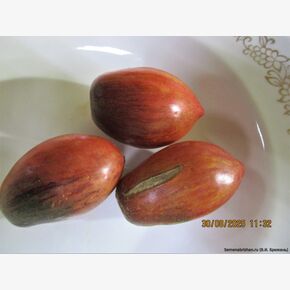 Этот коллекционный сорт был разработан Томом Вагнером в США и отличается своей уникальной окраской и другими характеристиками. Куст достигает высоты около 60 см и имеет компактную форму. Эффектный среднеспелый (90-100 дней) сорт с мелкими (30–80 г) сливовидными плодами розового цвета с антоциановыми плечами и золотистыми полосками. Кусты компактные (0,4–0.6 м), урожайные, с отличным сладким вкусом, подходят для банок и свежих салатов. Основные характеристики сорта:Тип куста: Детерминантный (гномы), высота обычно около 60см. Куст изящный, слабооблиственный. Плоды: Удлиненные сливки с носиком. Цвет: Розовые с антоциановыми (темными, сине-фиолетовыми) плечами и желто-оранжевыми прожилками. Чем больше солнца, тем ярче антоциан. Вес: В среднем 30–70 гр. Вкус: Сладкий, фруктовый, мякоть мясистая и сочная. Урожайность: Высокая, плодоношение длительное. Особенности выращивания: Место: Требует максимального солнечного освещения для проявления окраски. Формирование: Часто не требует пасынкования, но из-за перегруза урожаем желательна подвязка к опоре. Универсальность: Подходит для открытого грунта, теплиц и выращивания в горшках/контейнерах. Назначение: Идеальны для цельноплодного консервирования, вяления и свежего употребления. Сорт ценится за невероятно красивый внешний вид и отличный десертный вкус. В пакете 5 шт. семян.