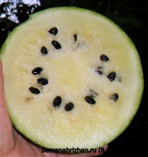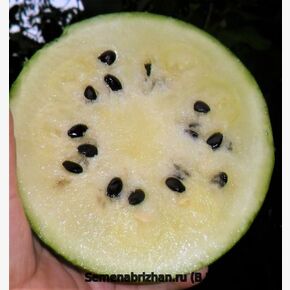 Раннеспелый коллекционный, урожайный сорт из США. Сорт 1986 года выпуска от сельскохозяйственного научного образовательного центра, университета Флориды США. Сорт раннеспелый, от всходов до начала созревания 60-63 дня. Сорт представлен крупными растениями с длинными плетями. Растение средней мощности, среднеплетистое. Длина главной плети менее 2-х метров. Стебель округло-граненый, средней толщины, с редким опушением. Лист сизо-зеленого цвета, рассеченный, доли средней величины. Лопасти основания листа не доходят друг до друга. Завязь шаровидная, немного опушенная. Тыквина шаровидной формы. Маленькие, порционные округлые плоды, весом около 3 кг, в серо-зеленую прочную внешнюю кожуру с рисунком из черепицы. Фон мраморный - светло-зеленый, рисунок — зелёная тонкая сетка. Плод небольшой, порционный, округлый или шаровидный. Мякоть сахаристая, тёмно-кремовая, очень сладкая, сочная, с прекрасной текстурой и приятным ароматом, нежная, сочная,сахаристая с оригинальными вкусовыми качествами и содержанием сухих растворимых веществ 12-13 %, волшебной радуги цвета и вкуса! Назначение – рекомендуется для употребления «с грядки», приготовления сочных цукатов и лечебного арбузного меда, для засолки и маринования. Этот арбуз ценится садоводами за необычный светлый вид коры и классический «сахарный» вкус мякоти, напоминающий десерт. Способность завязывать плоды даже при низких температурах и в условиях недостатка освещения. Совершенно неприхотлив. Многоплодный, до 10-15 плодов на одном растении при регулярных сборах. Плоды хорошо хранятся после съёма. Очень ранний сорт с высоким содержанием сахаров.Сохраняет свой превосходный вкус и спелую текстуру в течение длительного времени после срезки (через 100 дней после всходов). Предназначен для выращивания в пленочных теплицах и в открытом грунте.Сорт относительно засухоустойчив, слабо восприимчив к мучнистой росе, антракнозу и фузариозу, отлично подходит для холодных мест. Сорт считается неприхотливым, адаптированным к непростым погодным условиям.В пакете 5 шт. семян.