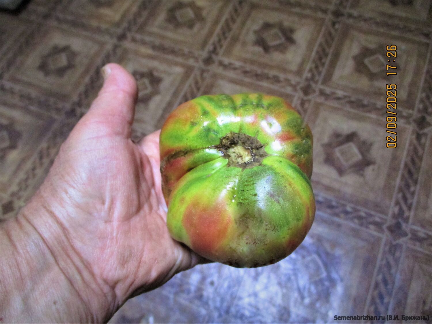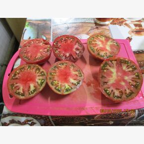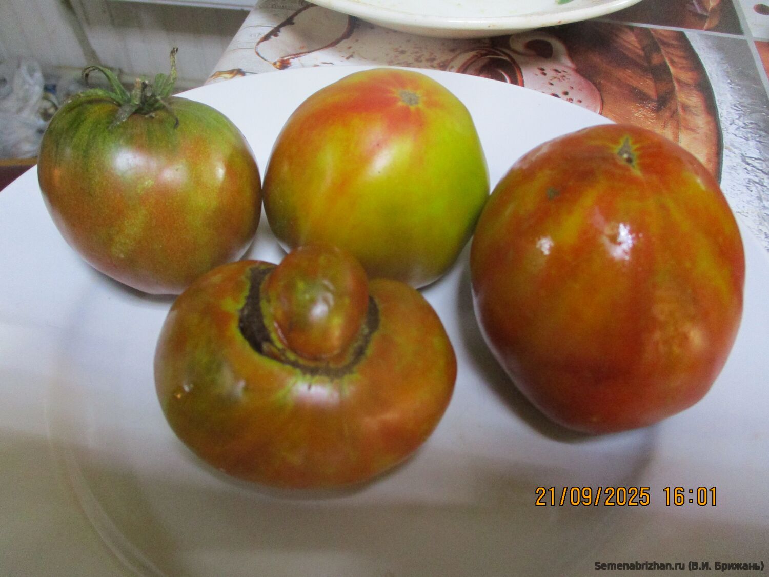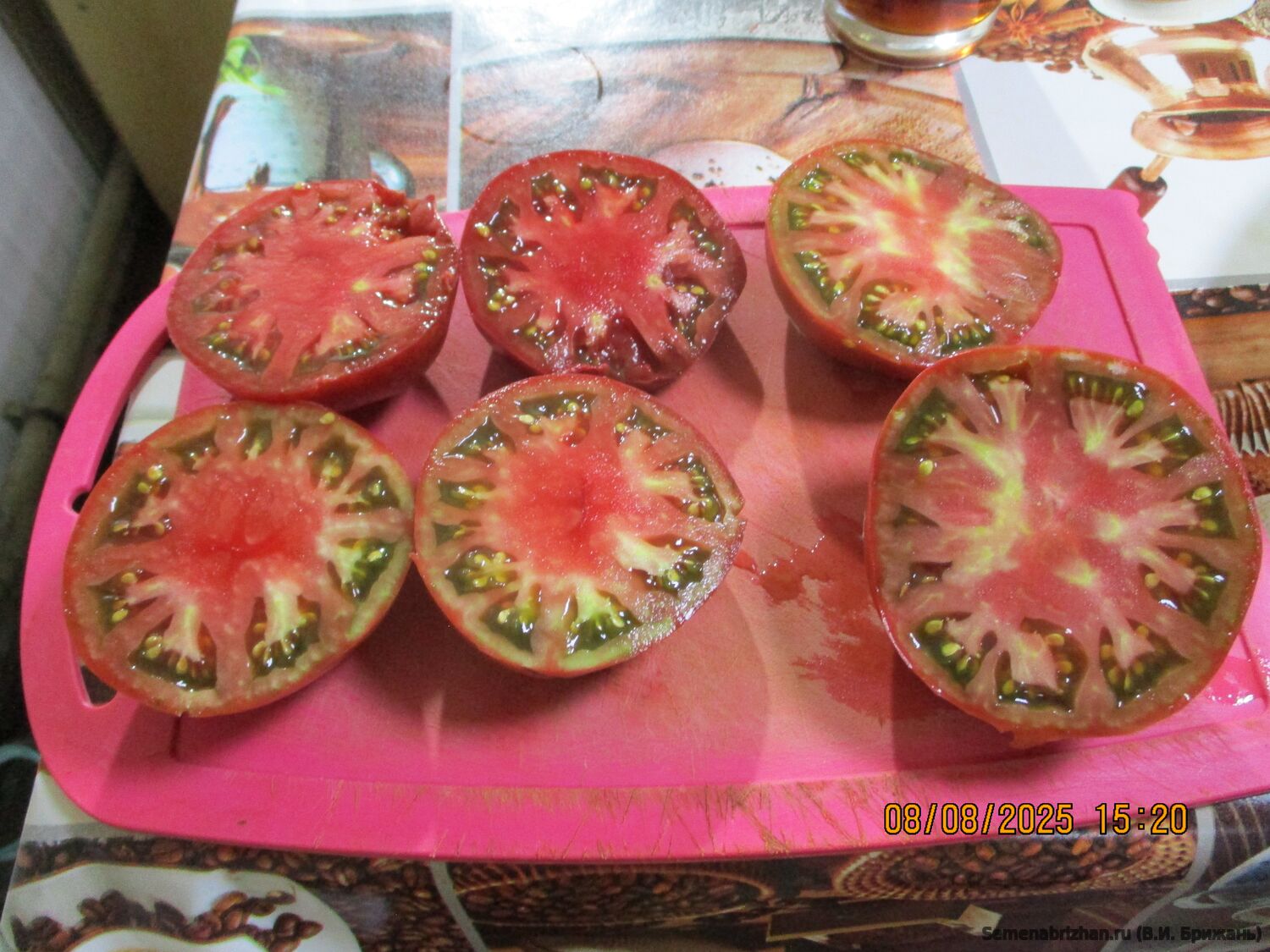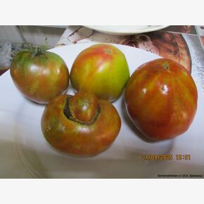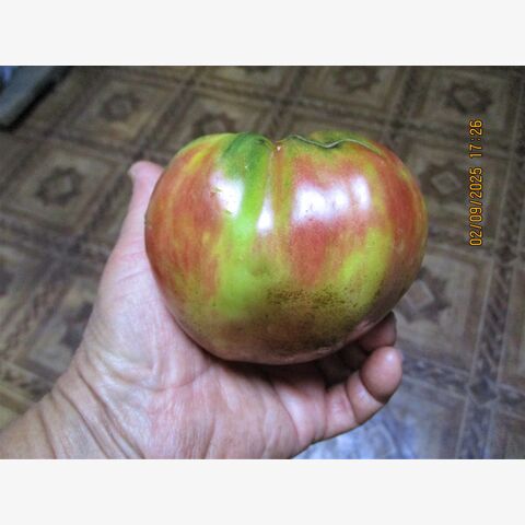 Томат First Mate (в переводе «Первый помощник») — это коллекционный экзотический сорт из США, созданный селекционером Миллардом Мёрдоком (Millard Murdock). Сорт ценится за уникальную трехцветную окраску, насыщенный сладкий вкус с фруктовыми нотками и высокую урожайность. Срок созревания: среднеспелый (или среднеранний), вызревание плодов наступает на 92–115-й день после полных всходов. Тип куста: индетерминантный (неограниченного роста). Куст крепкий, коренастый. Высота: в теплице обычно достигает 1,6–1,8 м, в открытом грунте может быть ниже — около 1–1,2 м. Лист: обычного типа (регулярный). Формирование: рекомендуется выращивать в 1–2 стебля с обязательным пасынкованием и подвязкой к опоре. Сорт относится к категории биколоров или триколоров из-за сложной окраски: Цвет: Уникальный трехцветный — внешне плоды коричнево-медные с оливково-зелеными и розовыми полосами и пятнами. Мякоть: многоцветная (мраморная), на разрезе преобладает ярко-розовый и зеленый цвета. Форма: плоско-округлая, слегка вытянуто-приплюснутая, иногда ребристая, часто типа «бифштекс» (мясистые, многокамерные). Вес: в среднем 150–350 г, при хорошем уходе отдельные плоды могут достигать 400–600 г. Мякоть: Сочная, красивая на разрезе (сочетание оливкового, розового, красного), очень нежная. Вкус: очень сладкий, насыщенный, с богатым ароматом, который некоторые дегустаторы описывают как «дымный» или прянно-фруктовый. Применение и особенности; сорт лучше всего раскрывает свои вкусовые качества при употреблении в свежем виде, в салатах и для приготовления соусов и соков. Специалисты отмечают, что плоды желательно употреблять в состоянии «аль денте» (чуть недозревшими), так как при перезревании они могут терять часть вкусовых нюансов. Сорт ценится за великолепный вкус, необычный вид и устойчивость к болезням. Из минусов — тонкая кожица, из-за чего плоды могут плохо храниться. Сорт отличается хорошей устойчивостью к болезням и стабильным плодоношением до заморозков. В пакете 20 шт. семян.